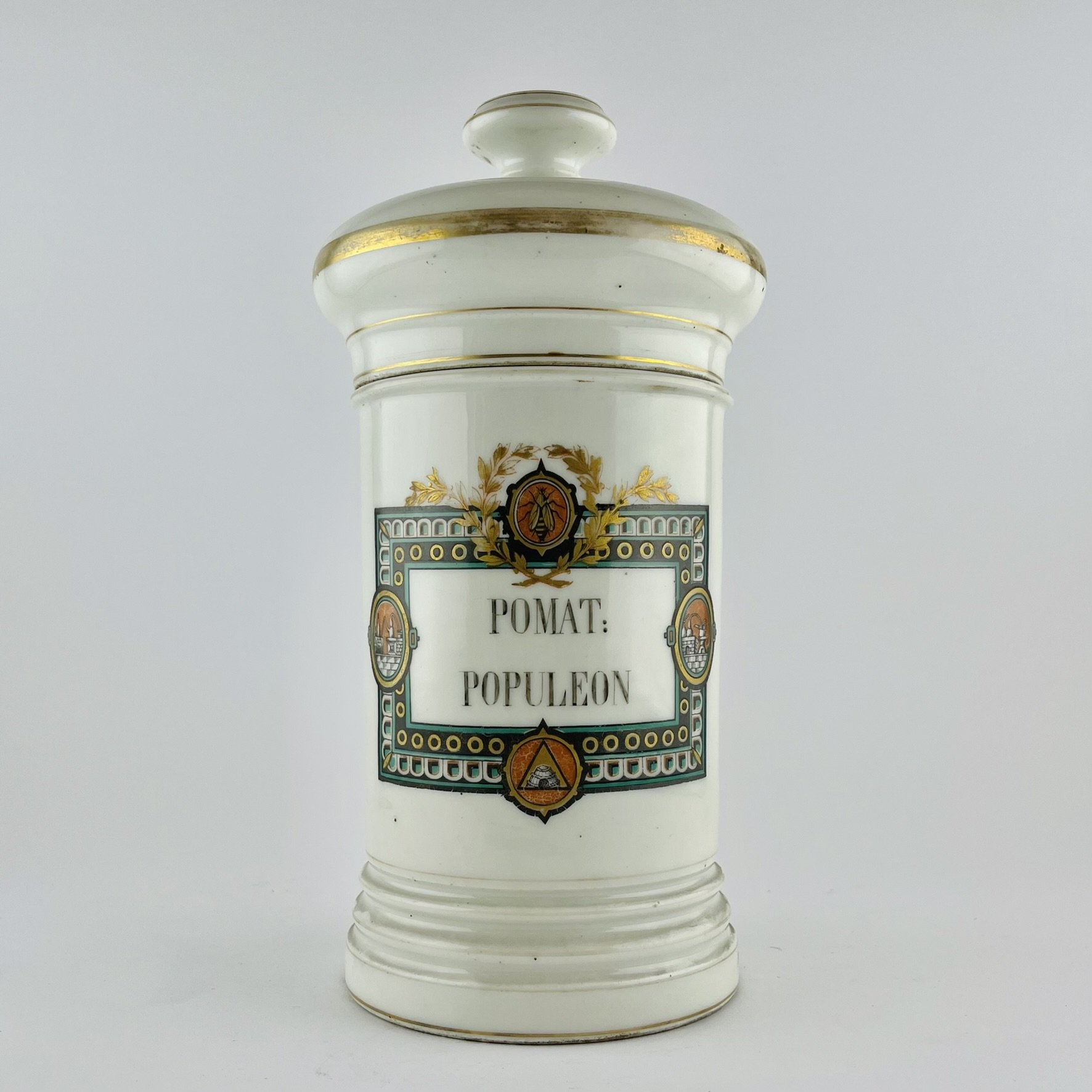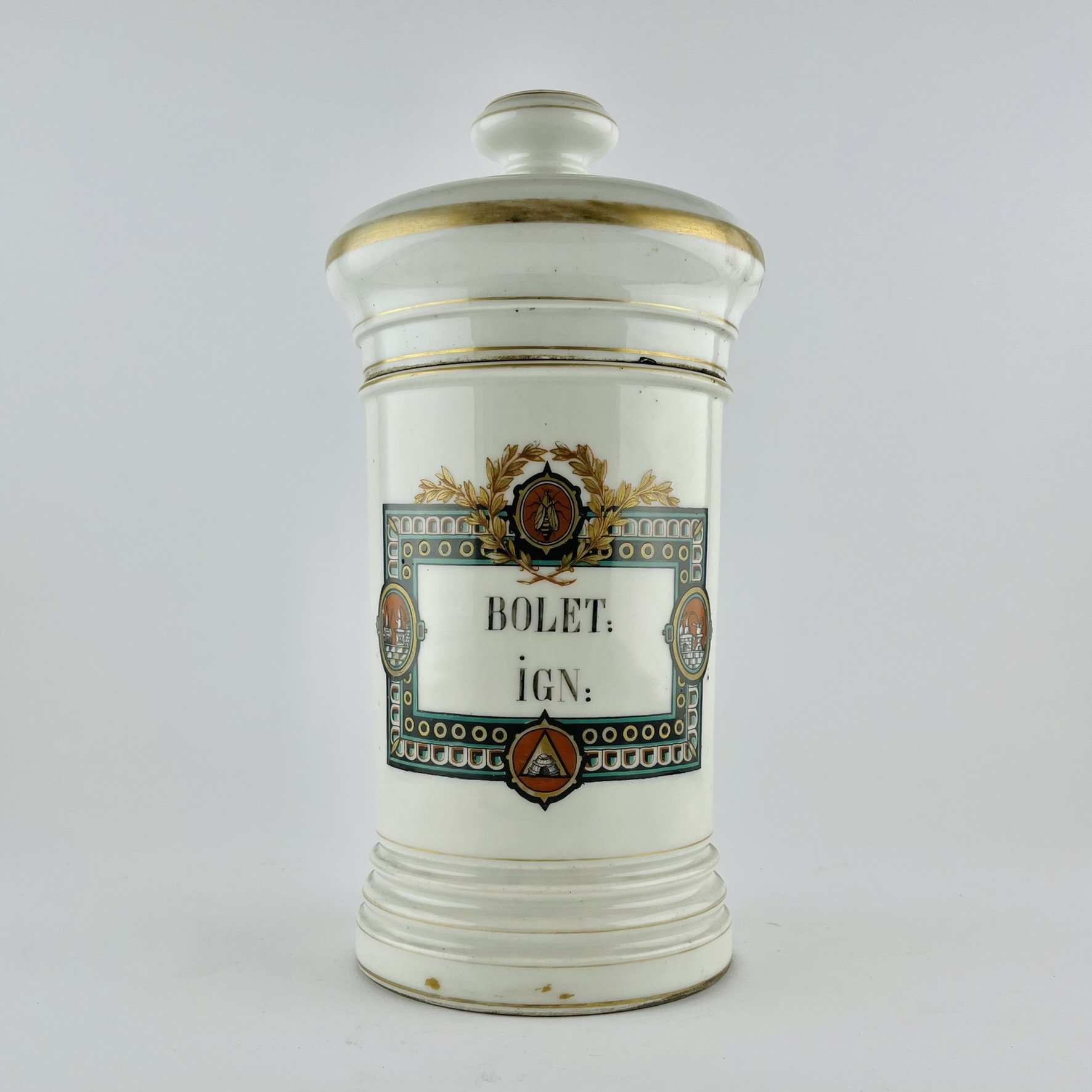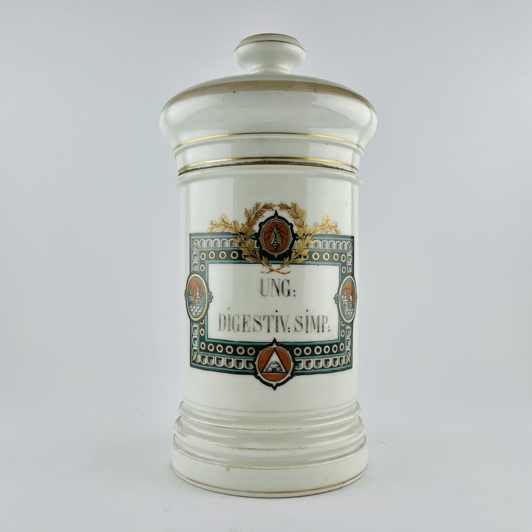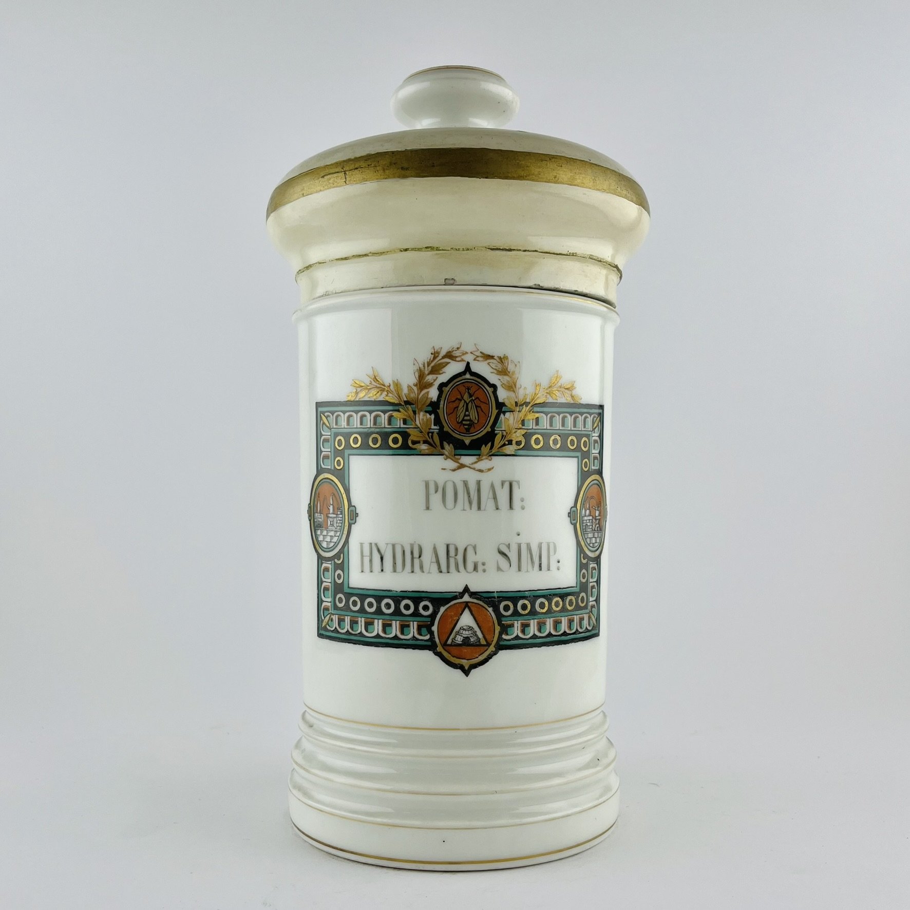 Juego de cinco frascos de farmacia en porcelana. Cartelas pintadas a mano «abeja, hojas de olivo y símbolos farmacéuticos», con inscripciones «Bolet: Ign:», «Pomat: Populeon», «Cera Flava», Pomat: Hydrarg: Simp:» y «Ung: Digestiv: Simp». Guardas y realces en oro. Uno fisurado, dos con cascaduras en tapa. 25 x 12 cm.