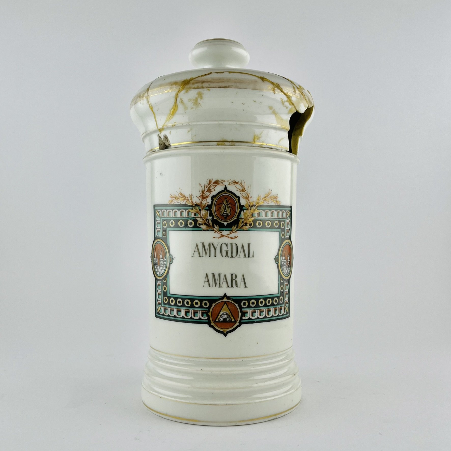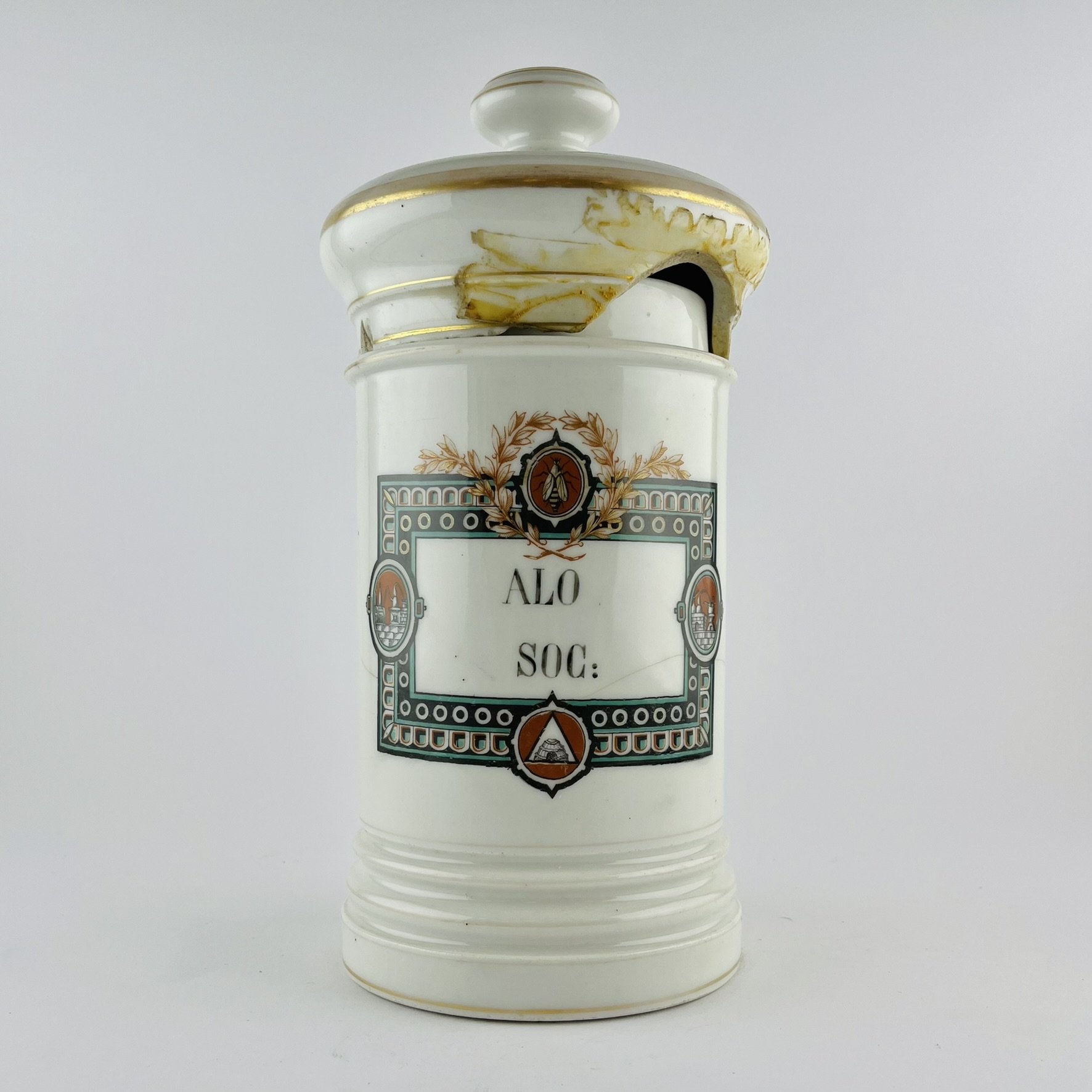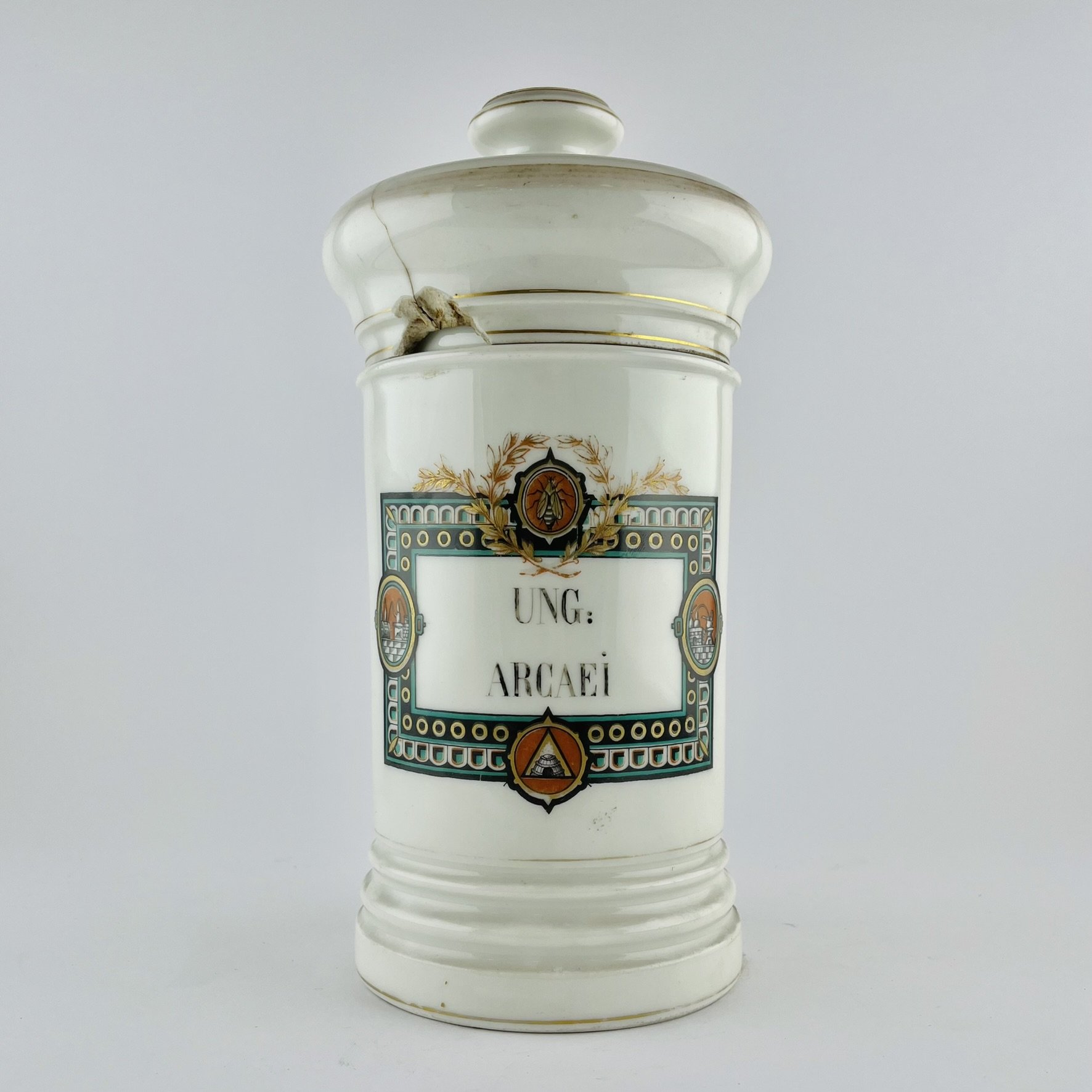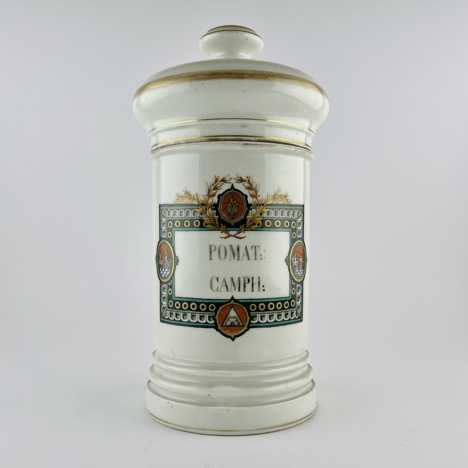 Juego de cinco frascos de farmacia en porcelana. Cartelas pintadas a mano «abeja, hojas de olivo y símbolos farmacéuticos», con inscripciones «Ung Arcaei», «Alo Soc:», «Pomat Camph:» y «Amygdal Amara». Guardas y realces en oro. Tapas averiadas. Un frasco averiado. 25 x 12 cm.