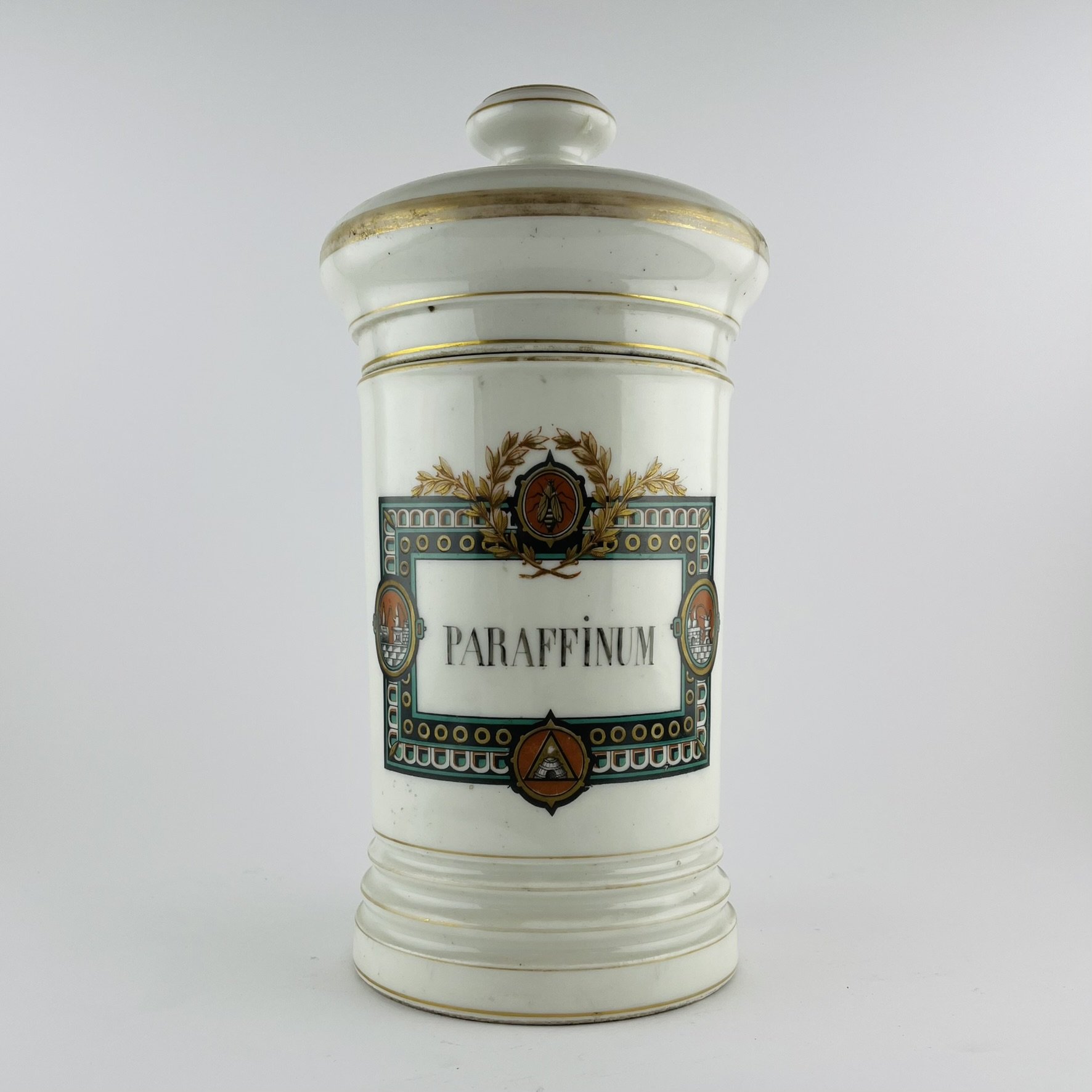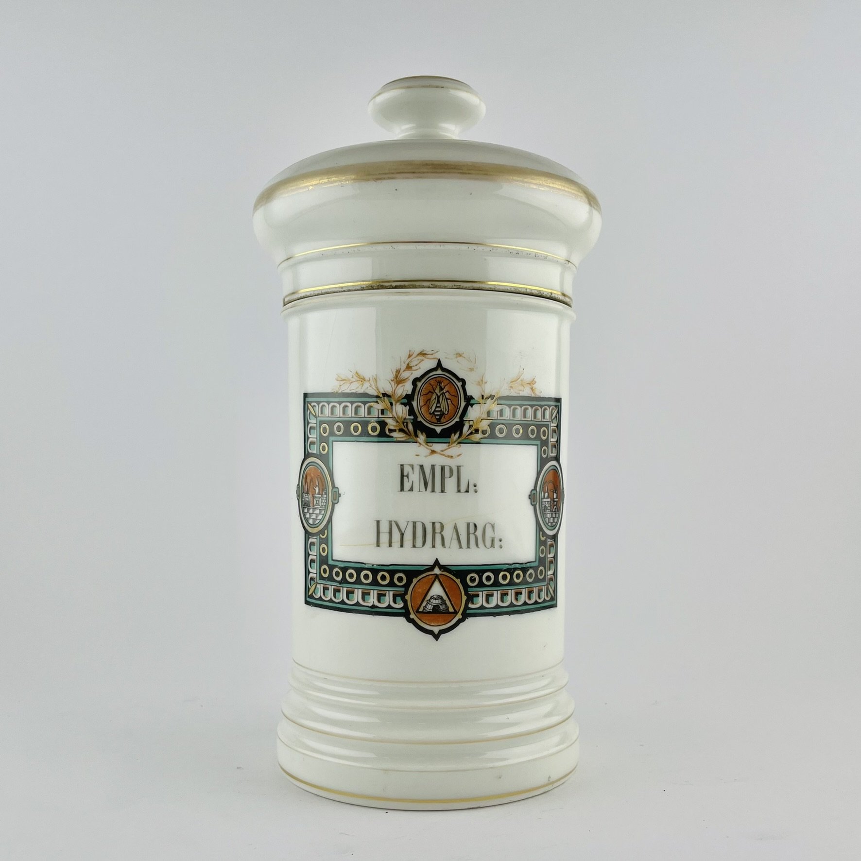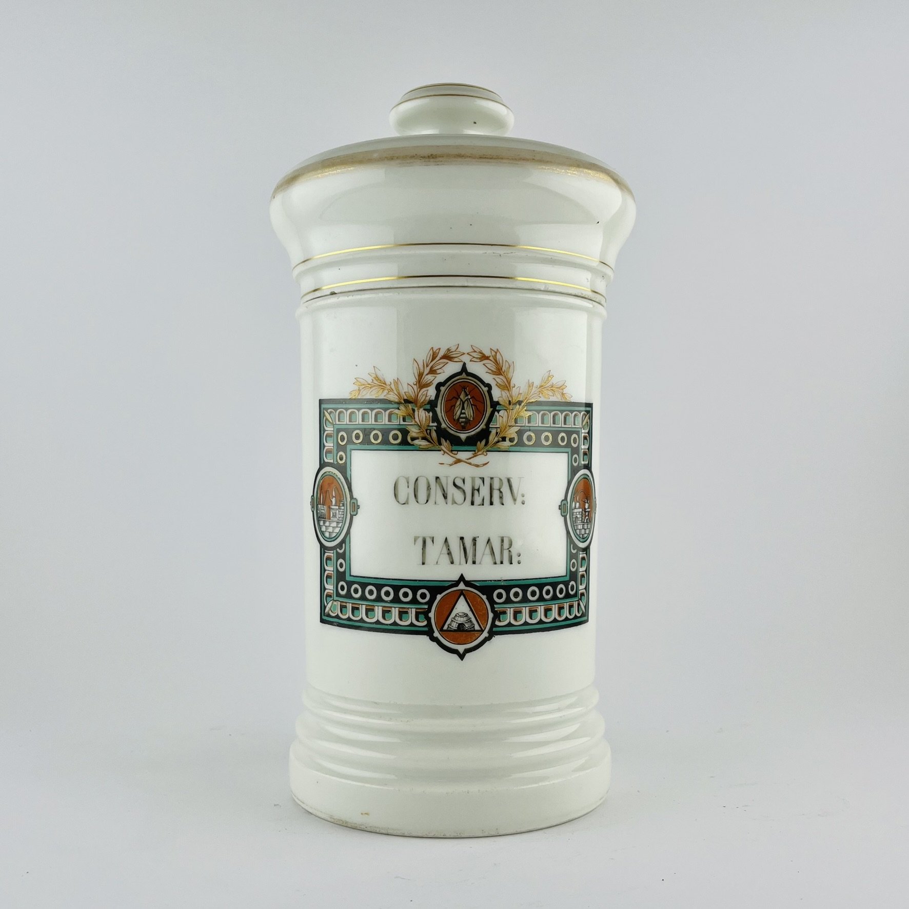 Juego de cinco frascos de farmacia en porcelana. Cartelas pintadas a mano «abeja, hojas de olivo y símbolos farmacéuticos», con inscripciones «Conserv: Tamar:», «But: Cacao», «Empl: Hydrarg:», Crocus Sativ» y «Paraffinum». Guardas y realces en oro. Cuatro con tapas cascadas. Altos 25 cm.
