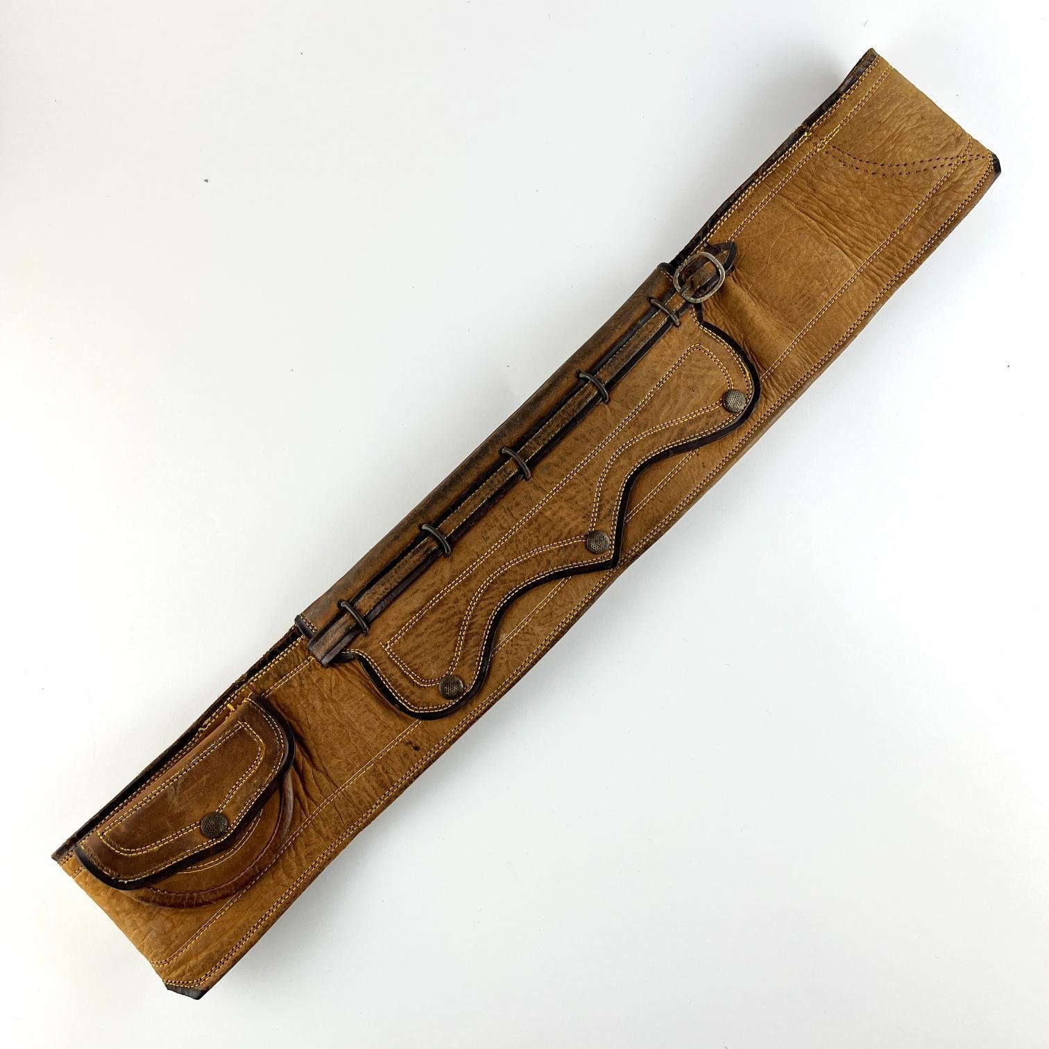 Cinto gaucho en cuero marrón, con bolsillos, costuras en hilo amarillo y hebilla rectangular en metal.