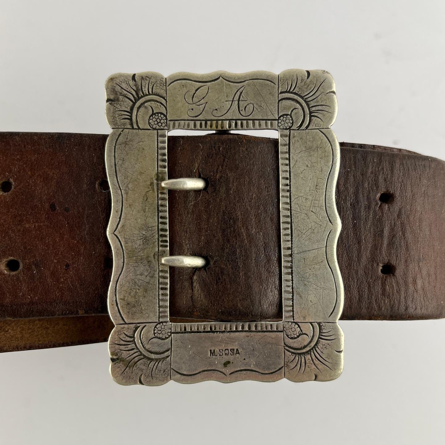 Cinto gaucho en cuero marrón, con hebilla rectangular en plata cincelada «flores» y grabada con iniciales «G.A.». Con punzón del platero M. Sosa. Medidas hebilla 7.5 x 5.5 cm.