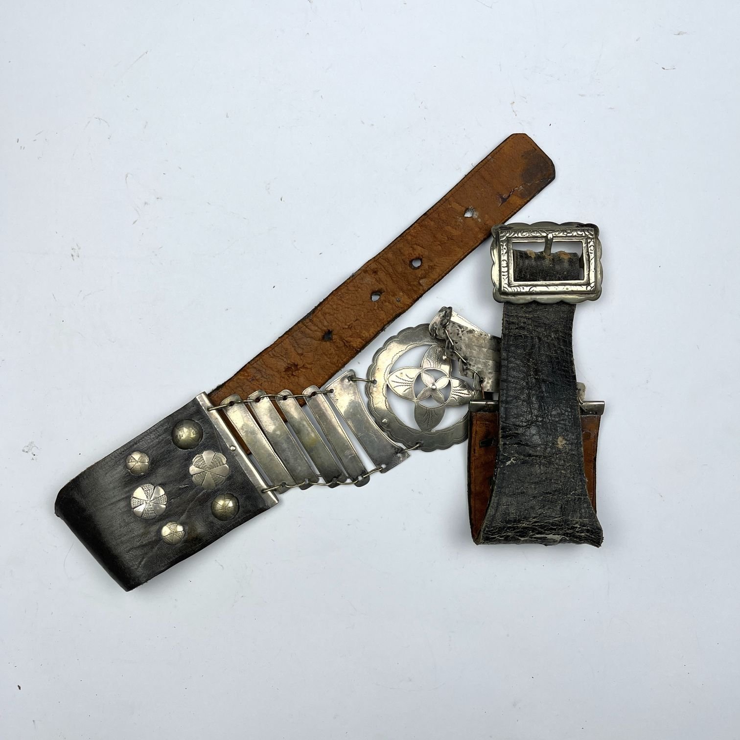 Cinto gaucho chileno en cuero con aplicaciones en plata, rastra en placas con medallón central en plata calada, con hebilla en metal blanco.