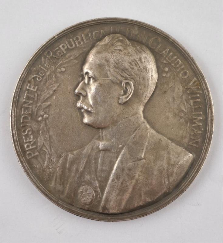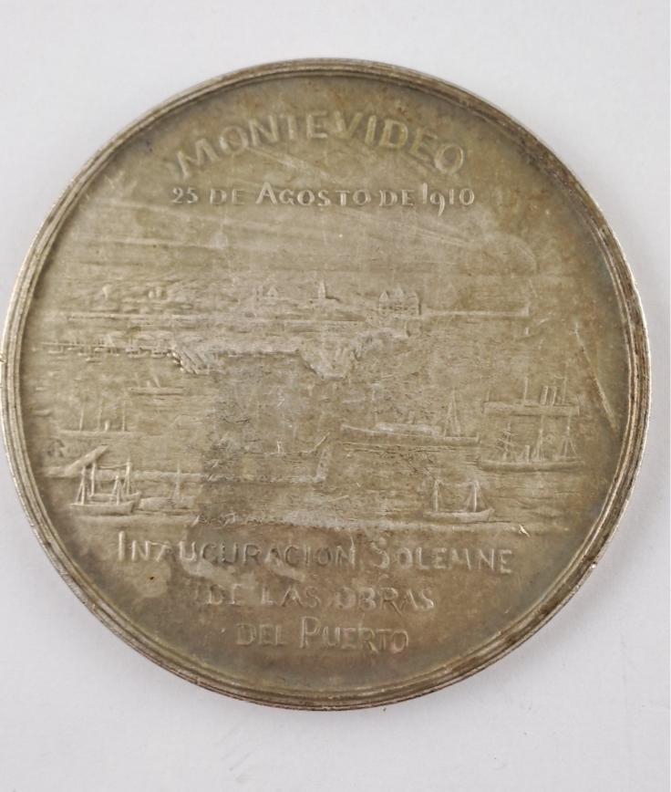 Medalla uruguaya en plata 950 sellada “argent”, con efigie del Presidente Claudio Williman, conmemorativa de la Inauguración solemne de las obras del puerto de Montevideo el 25 de agosto de 1910. Peso 147 gr.