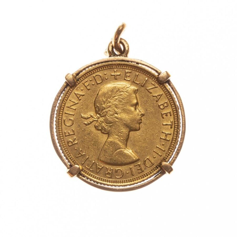 Colgante en oro 18 K amarillo con moneda británica en oro denominación 1 libra del año 1958. Diámetro 24 mm. Peso 10,1 gr.