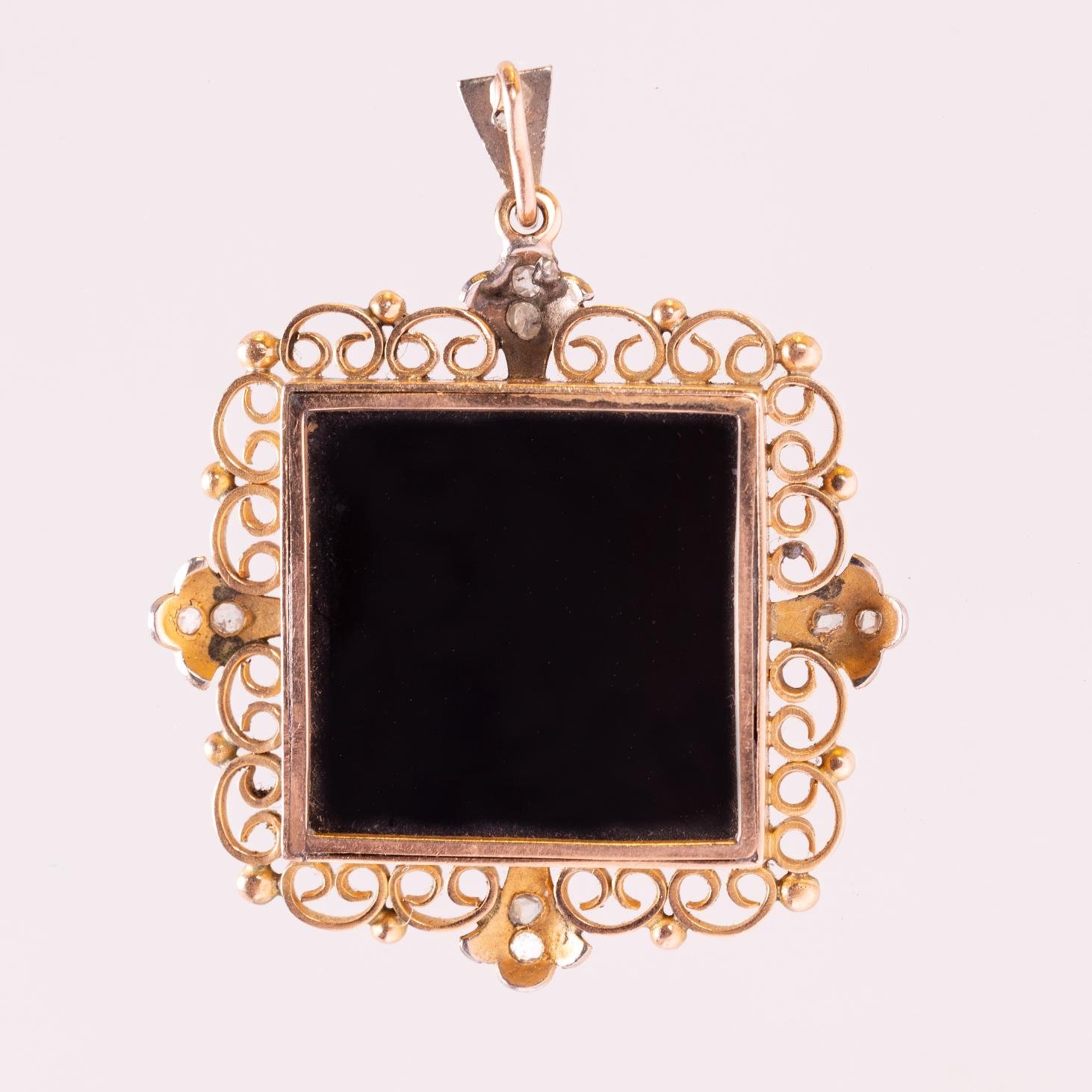 Colgante en oro amarillo con medallón central en ónix tallado «Mercurio», con nueve diamantes. 3,8 x 3,8 mm. Peso bruto 12,3 gr.