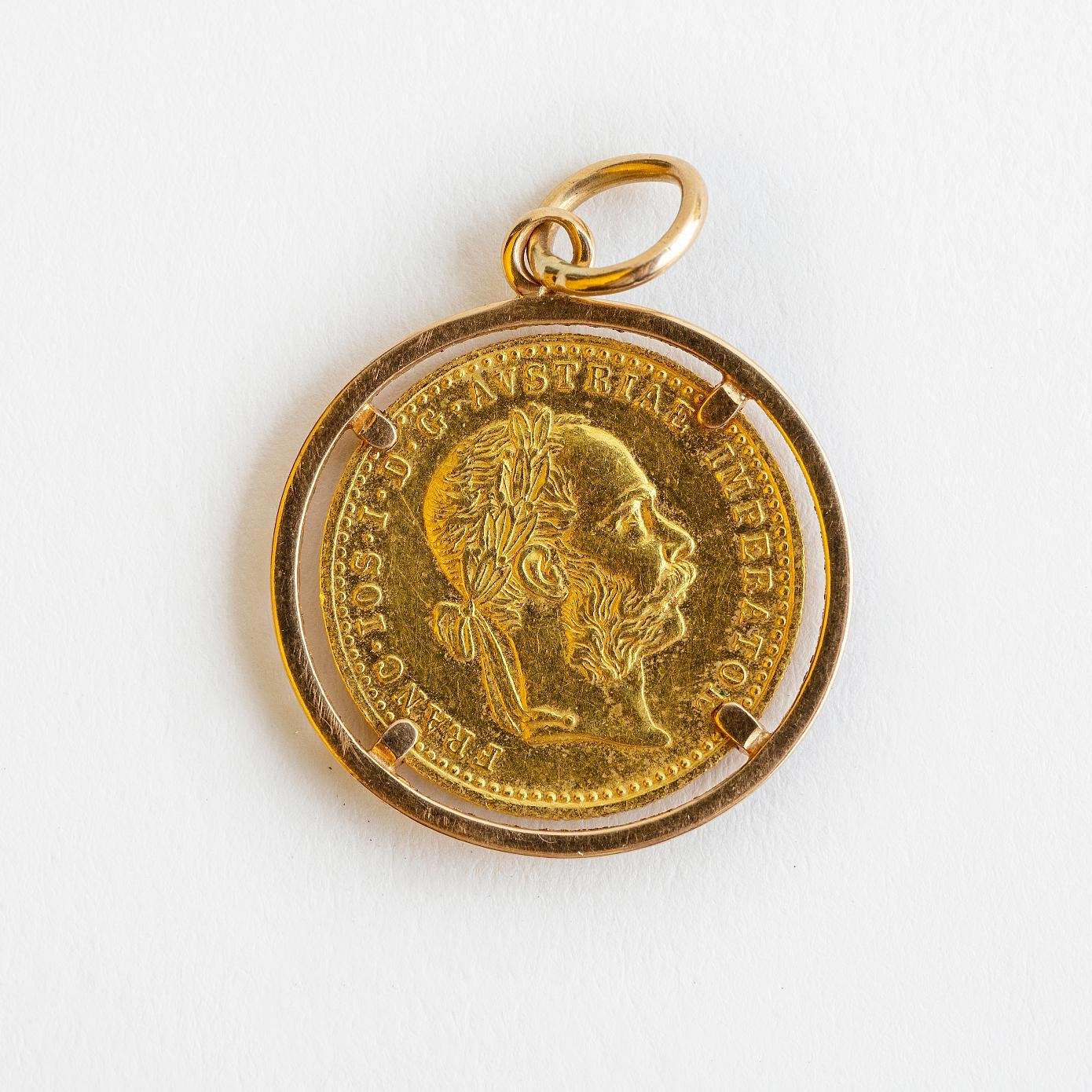 Colgante en oro 18 K amarillo con moneda austrohúngara en oro del año 1915. Peso 5 gr.