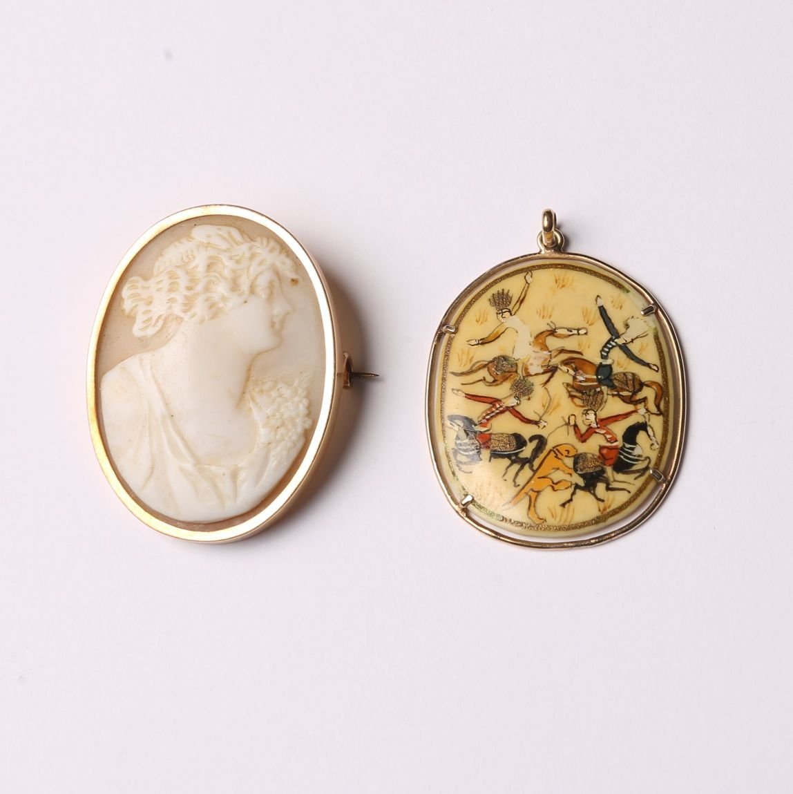 Dos piezas. Colgante indio en marfil pintado a mano «escena de cacería», con marco en oro 14 K amarillo. Alto 40 mm. Prendedor en oro amarillo con camafeo tallado «dama» en caracol. Alto 41 cm.