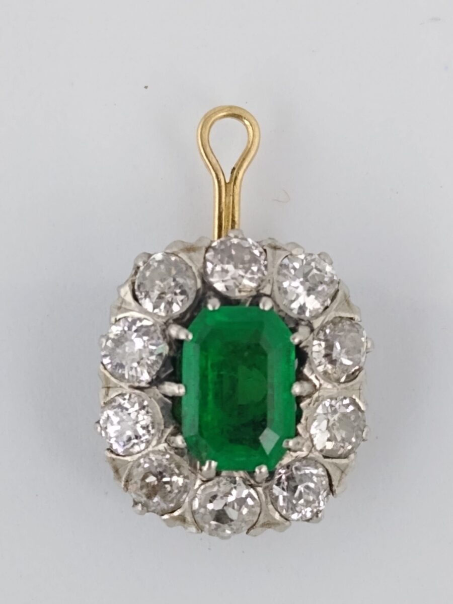 Par de colgantes en oro 18 K blanco y amarillo con esmeralda central de 7.5 x 5.1 x 3.1 mm rodeada por diez pequeños brillantes. 21 x 13 mm. Peso bruto 6.7 gr.