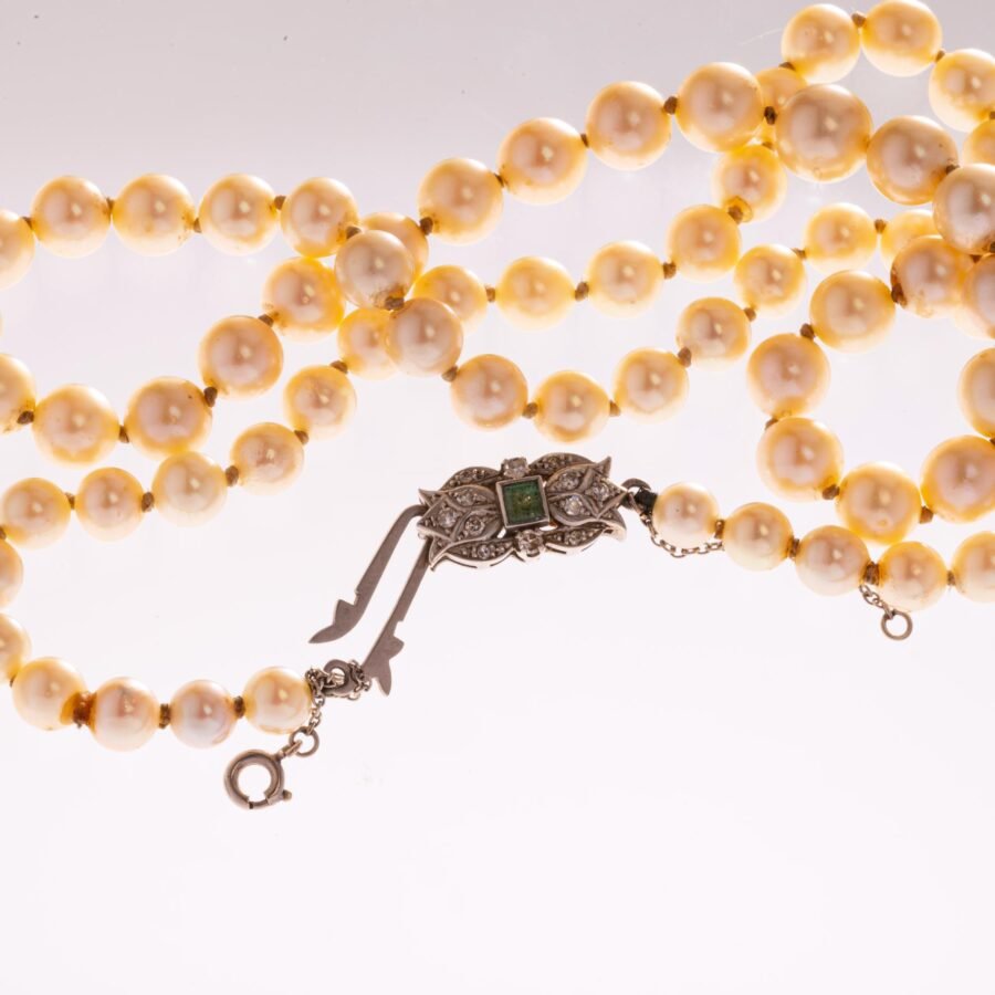 Collar de perlas, oro 18 K, esmeraldas y diamantes