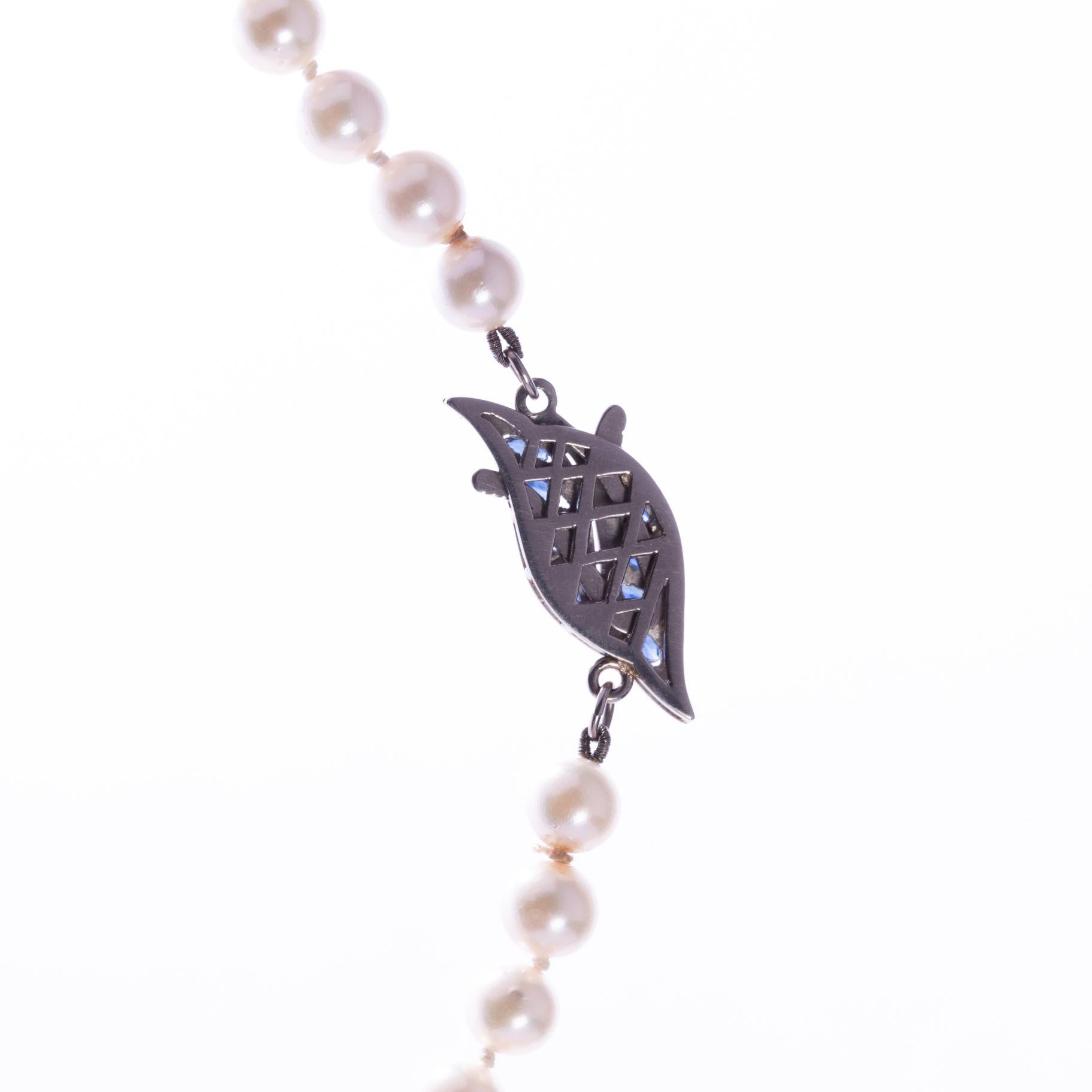 Collar en un hilo de perlas de cultivo de un diámetro de 7 mm, con broche en oro 18 K blanco esculturado en forma de hoja y decorado con ocho pequeños zafiros talla navette. Largo 57 cm.