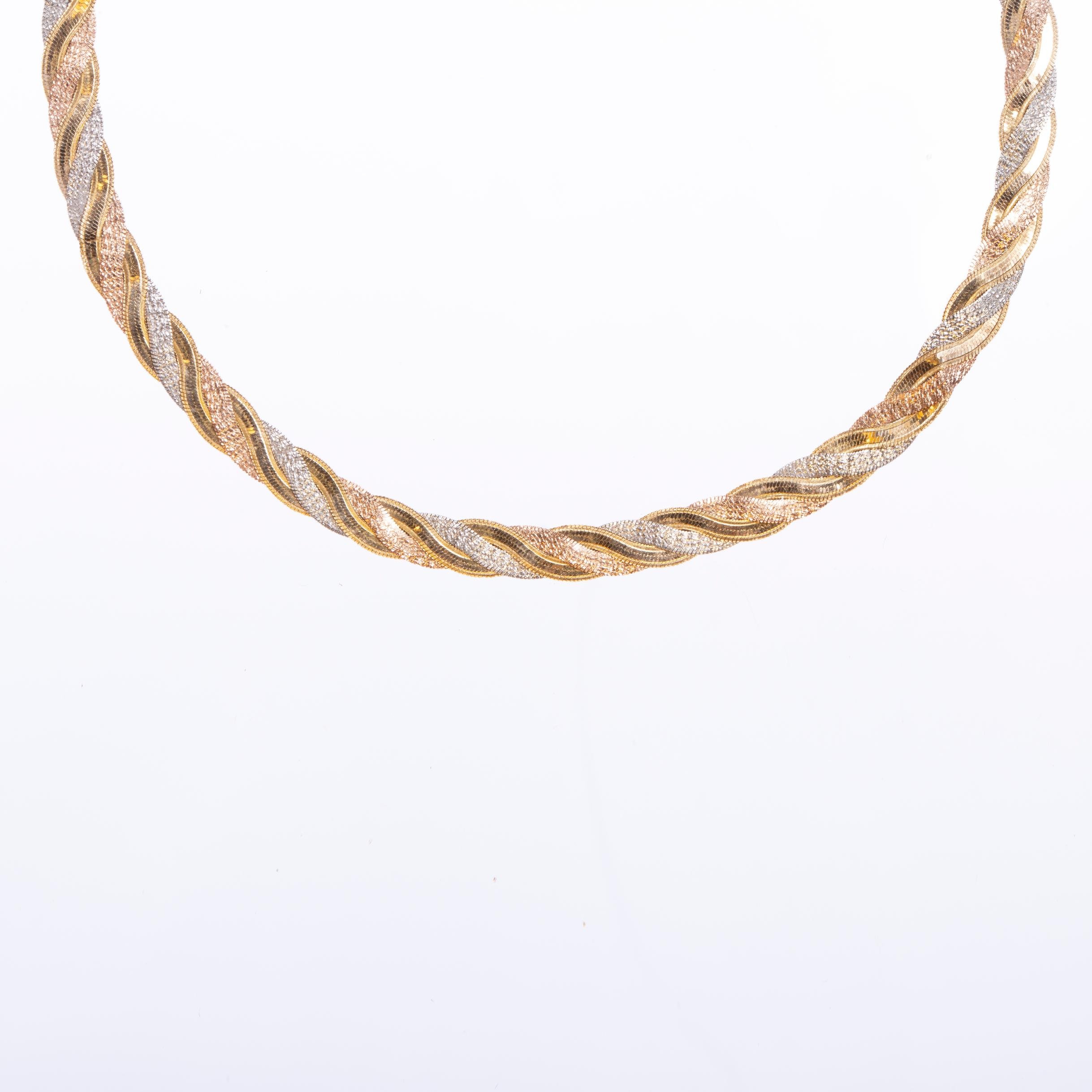 Collar flexible italiano en oro 14 K amarillo, blanco y rosado, trenzado. Largo 40 cm. Ancho 7 mm. Peso 16 gr.