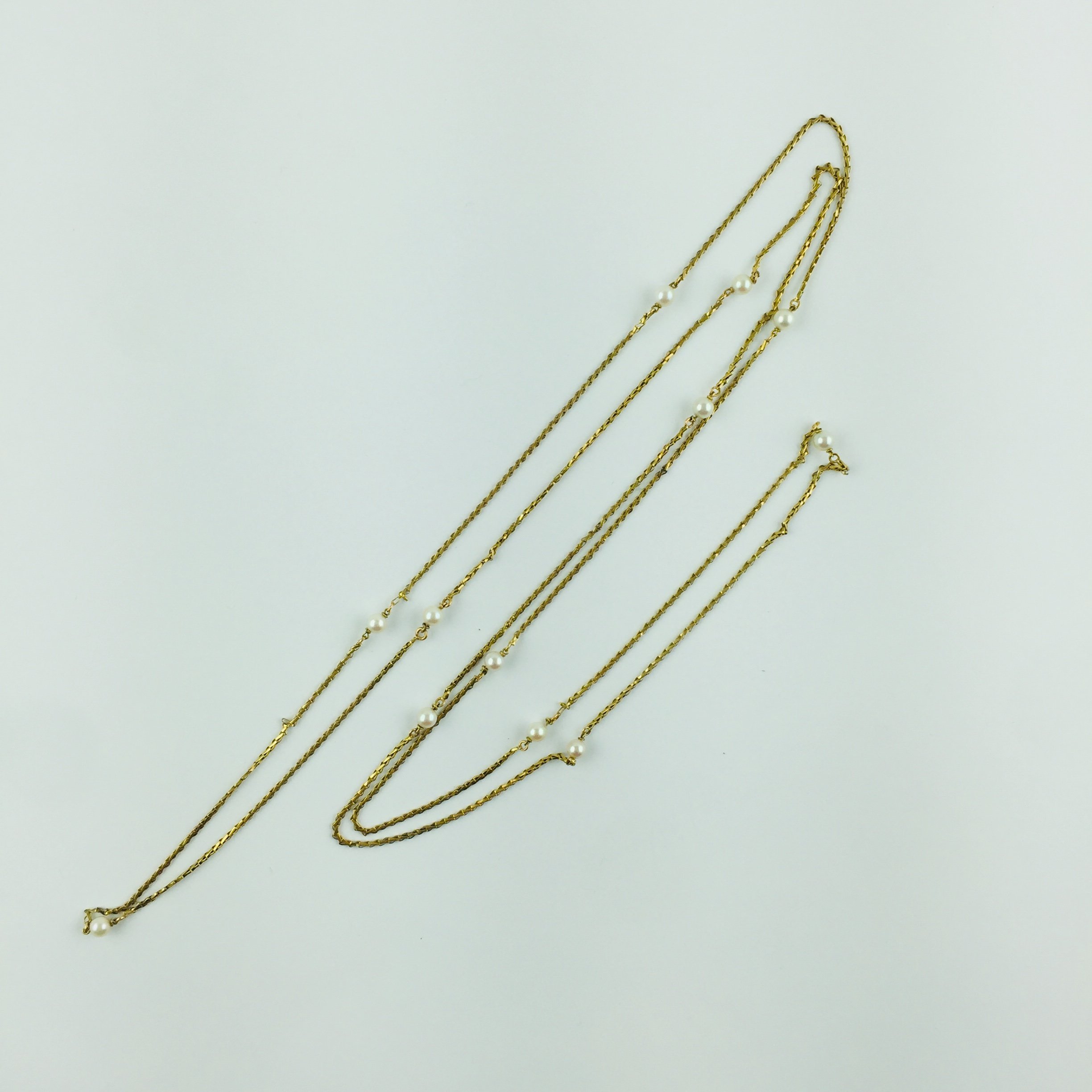 Collar tipo sautoir en eslabones de oro 18 K amarillo decorada con doce perlas de cultivo de un diámetro de 5 mm cada una. Largo 120 cm. Peso bruto 13 gr.