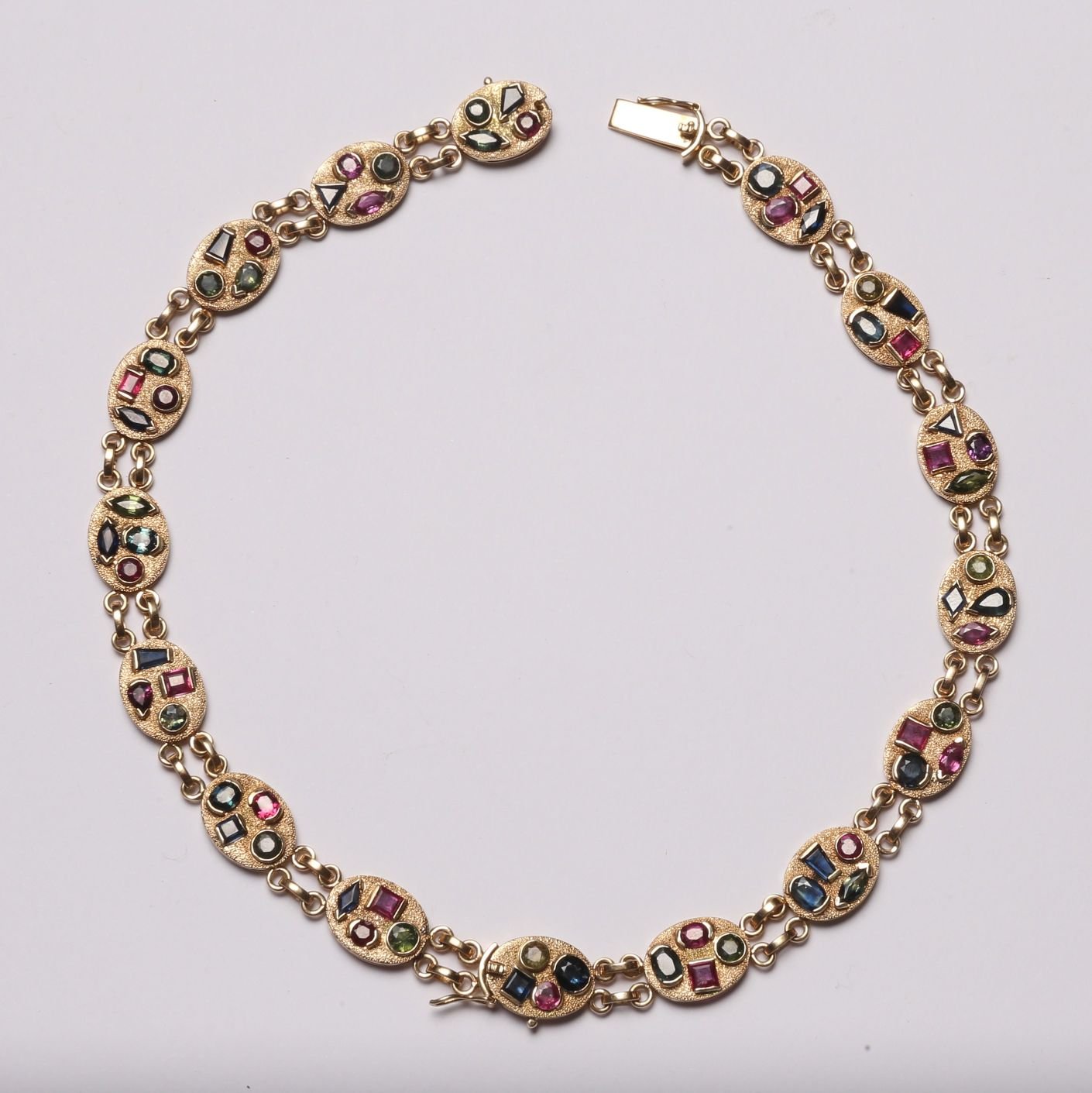 Set de collar convertible a par de pulseras en oro y diferentes piedras preciosas. Largo pulseras 19 cm. Largo collar 38 cm. Peso bruto 37 gr.