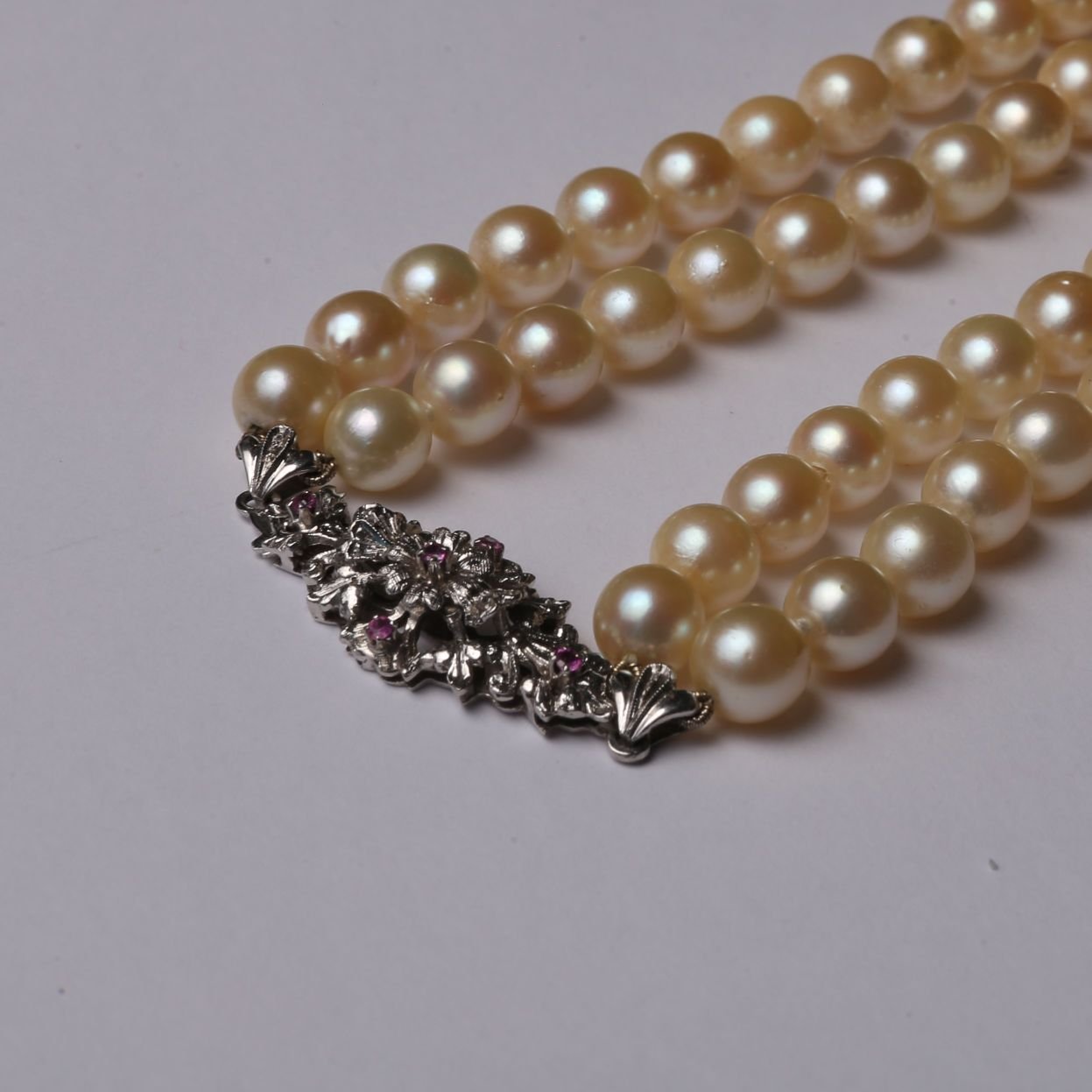 Collar en siete hilos de perlas de cultivo y granates de un diámetro de 4 y 5 mm respectivamente. Broche en oro 18 K. Largo 40 cm.