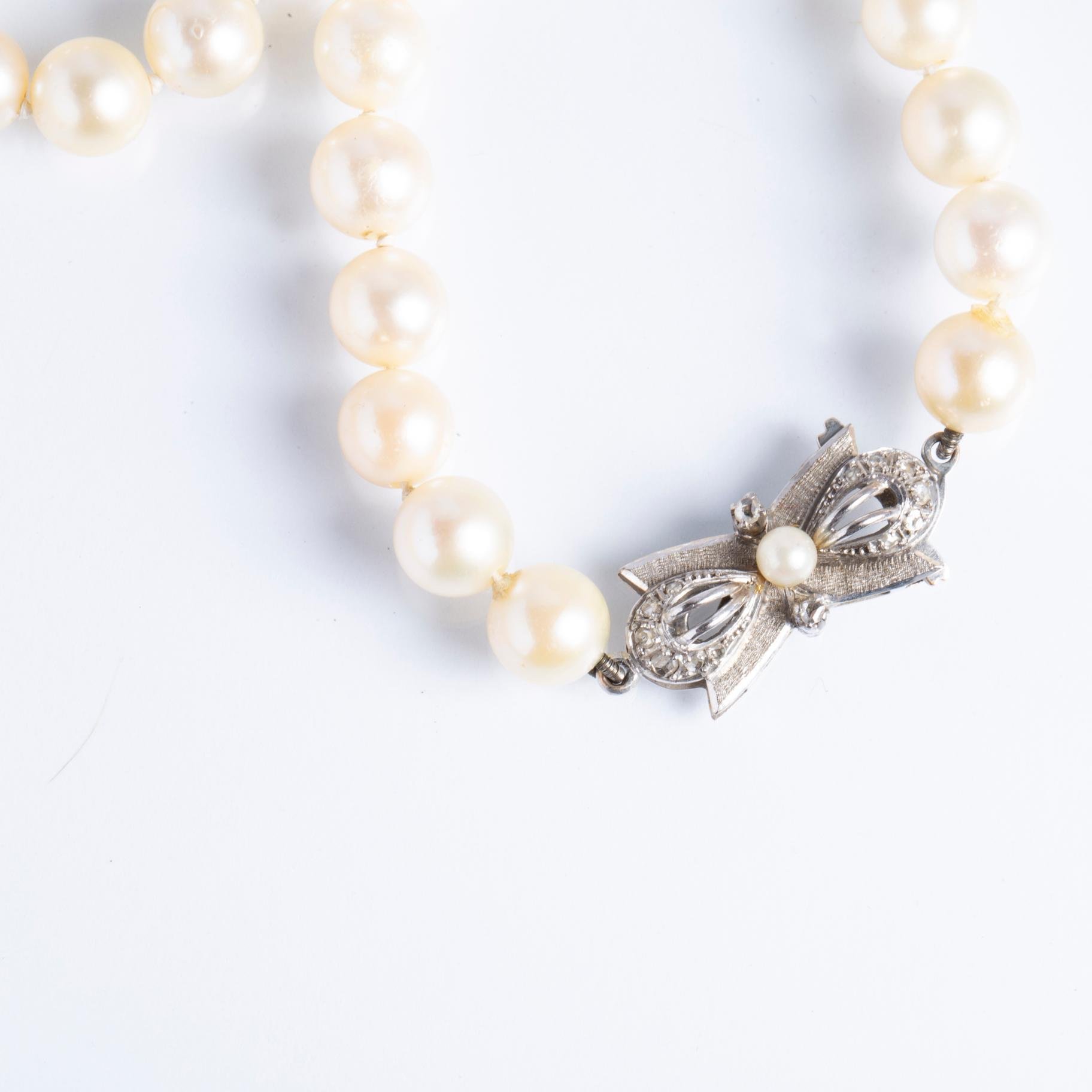 Collar en un hilo de perlas de cultivo, con prendedor en oro 18 K blanco decorado con pequeña perla de cultivo y diez diamantes. Largo 63 cm.