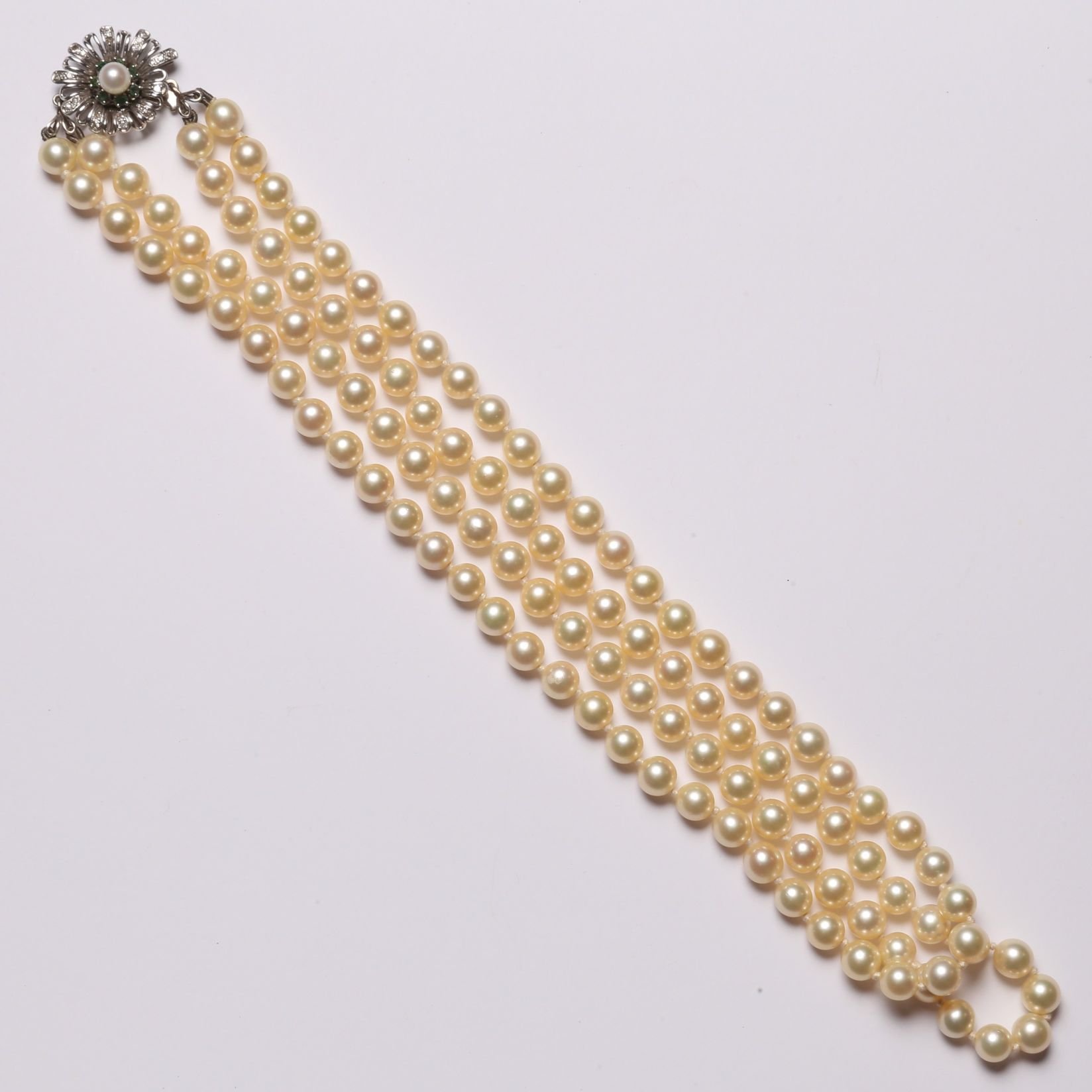 Collar en dos hilos de perlas de cultivo de un diámetro de 7.5 mm, en dos largos, el menor de 50 cm. Broche en oro 18 K blanco esculturado en forma de flor decorado con perla central de cultivo de un diámetro de 6 mm y veintiún pequeños brillantes y siete pequeñas esmeraldas talla redonda.