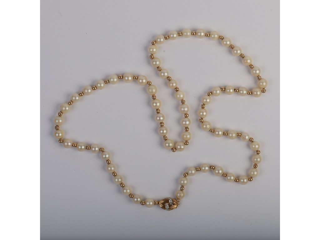 Collar en un hilo de perlas de cultivo de un diámetro de 8.5 mm intercaladas con cuentas en oro 18 K amarillo de un diámetro de 4 mm. Prendedor en oro 18 K amarillo y blanco con seis pequeños brillantes. Largo 75 cm.