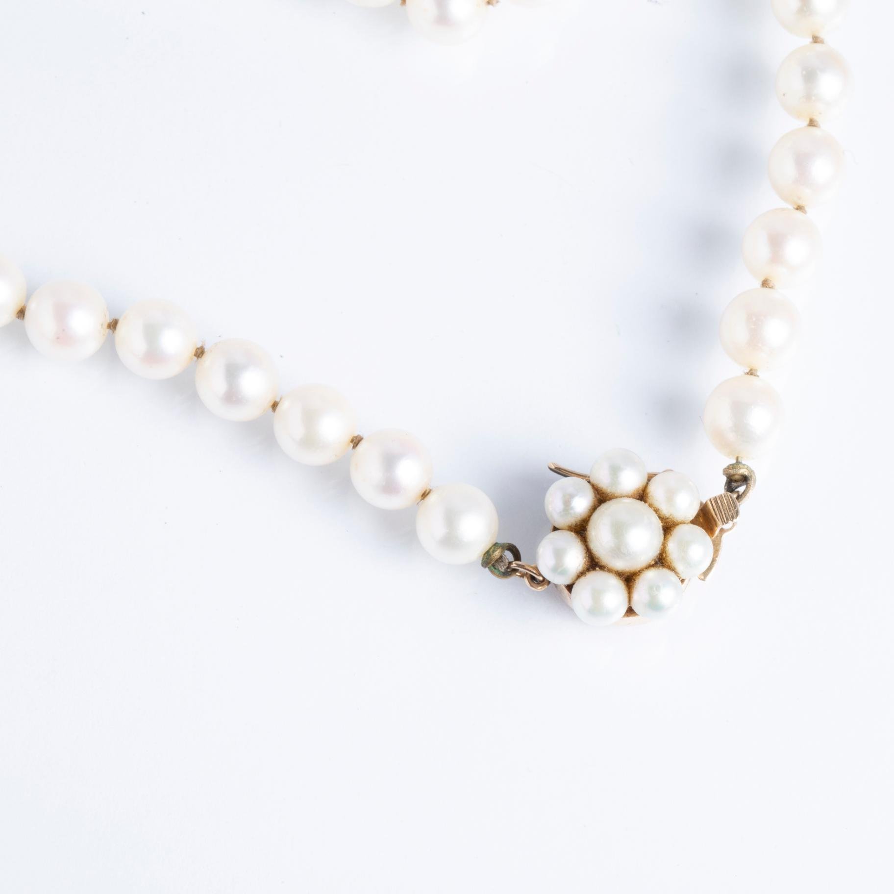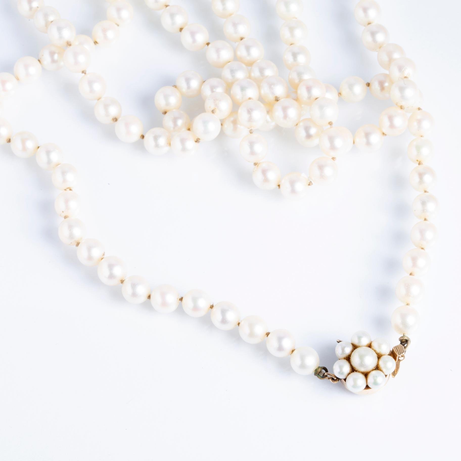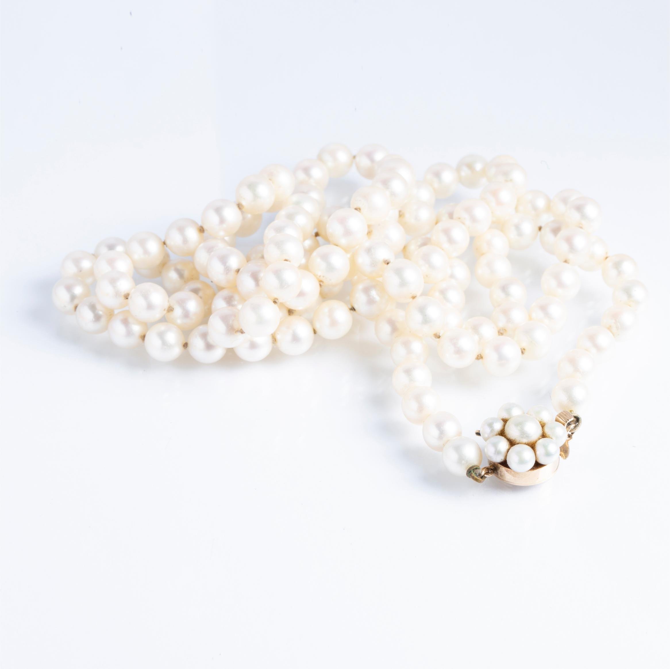 Collar en un hilo de perlas de cultivo de un diámetro de 7 mm con broche en oro 14 K amarillo. Largo 90 cm.
