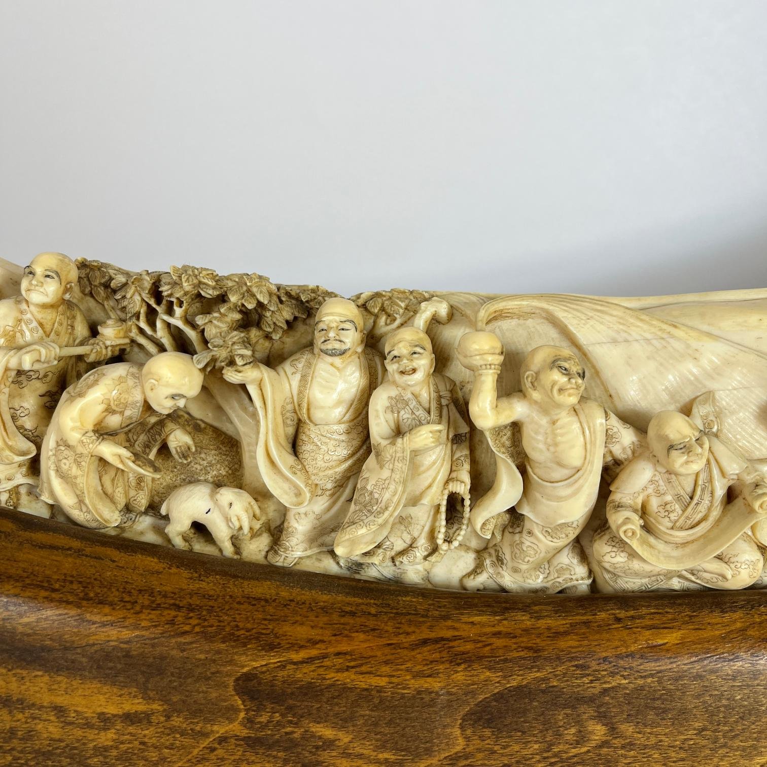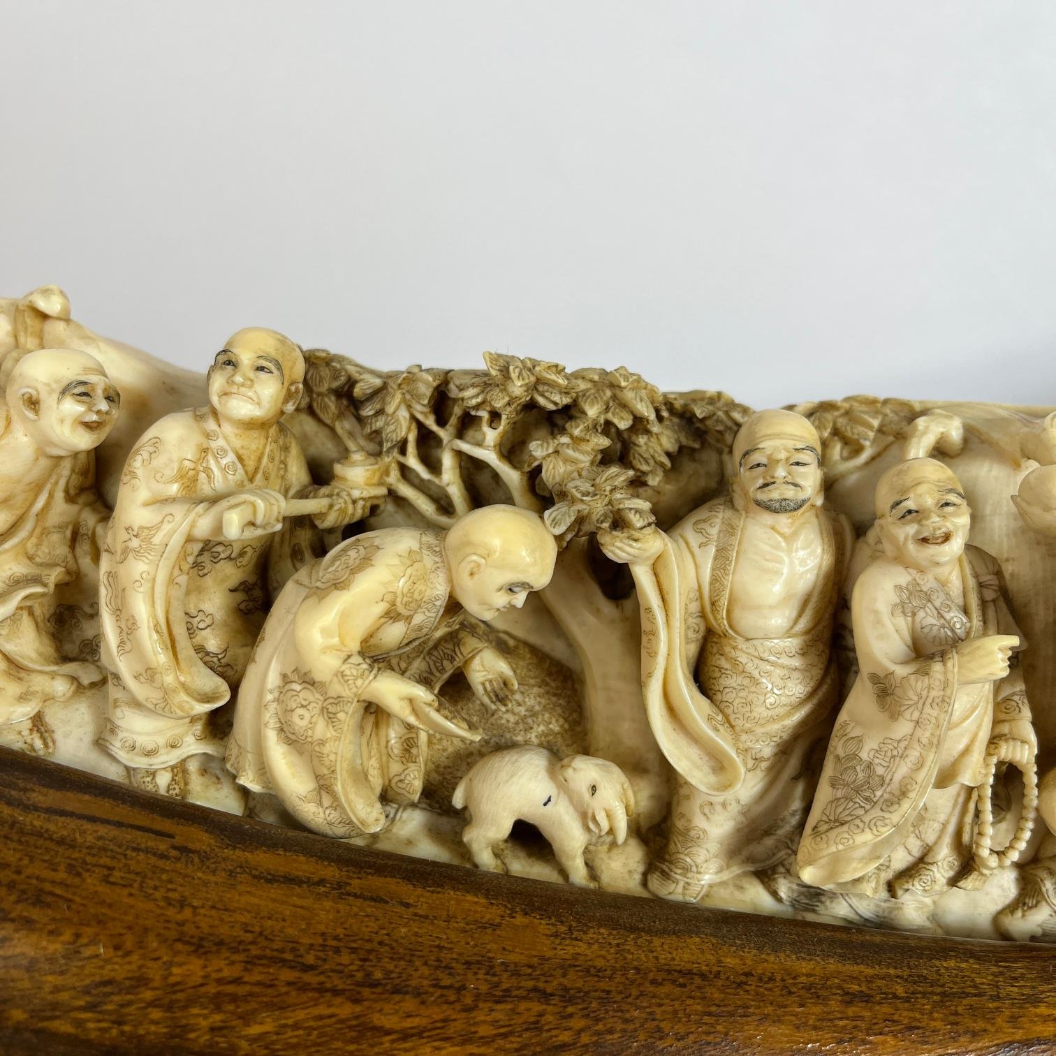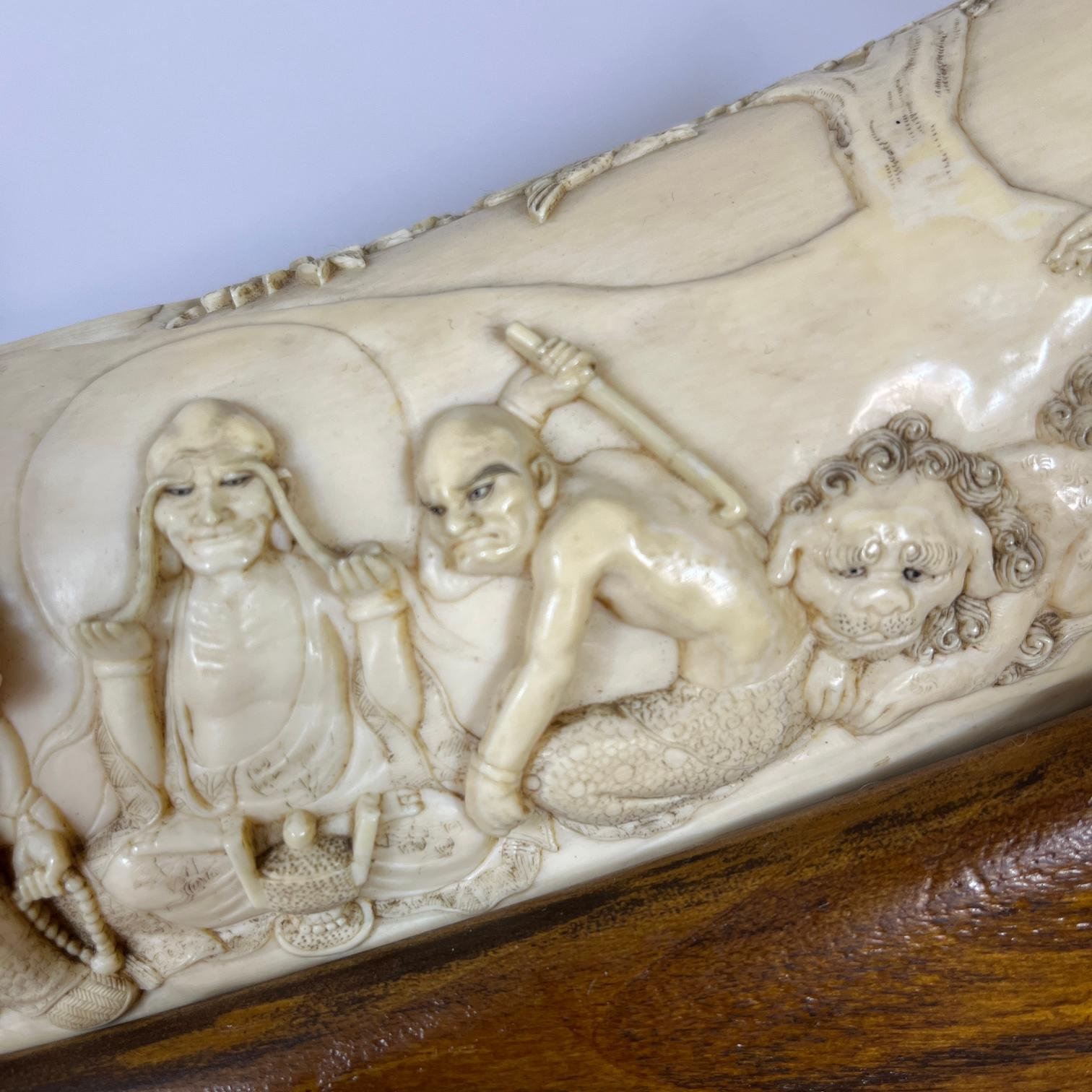 Colmillo de elefante tallado en altorrelieve. Firmado «Kodo», Japón. Período Meiji. Largo 70 cm. Presentado en soporte de madera.