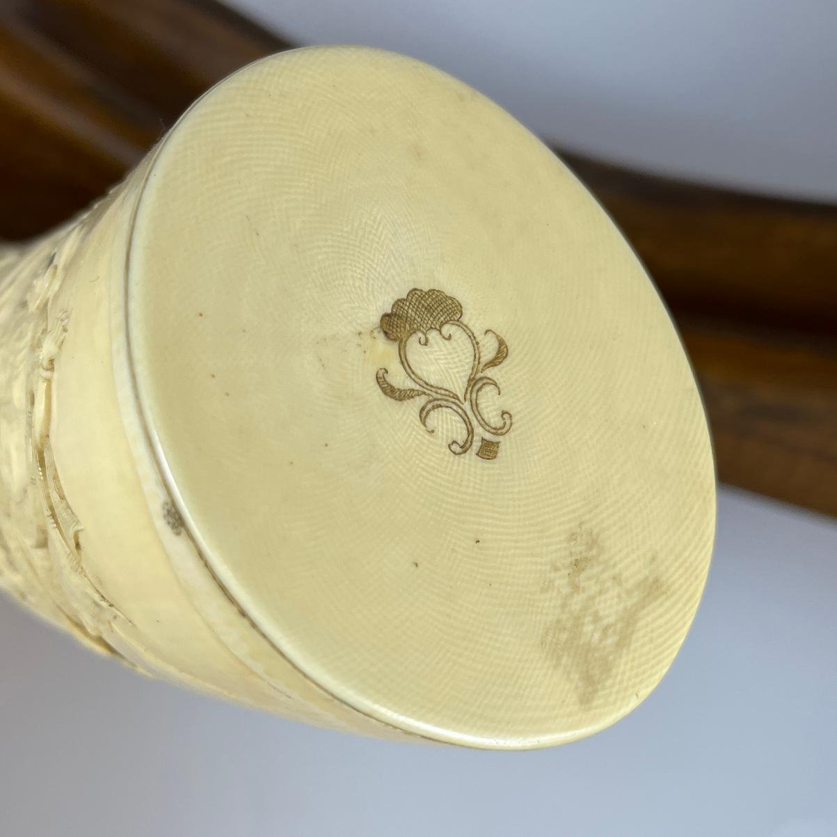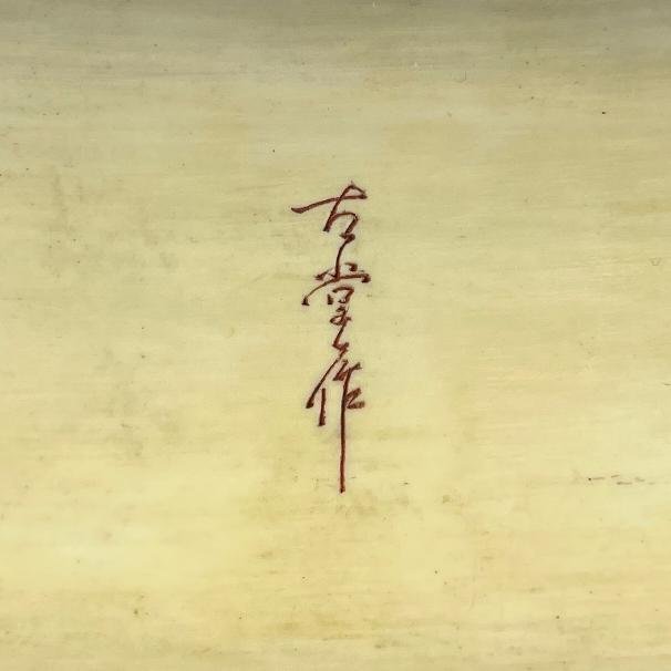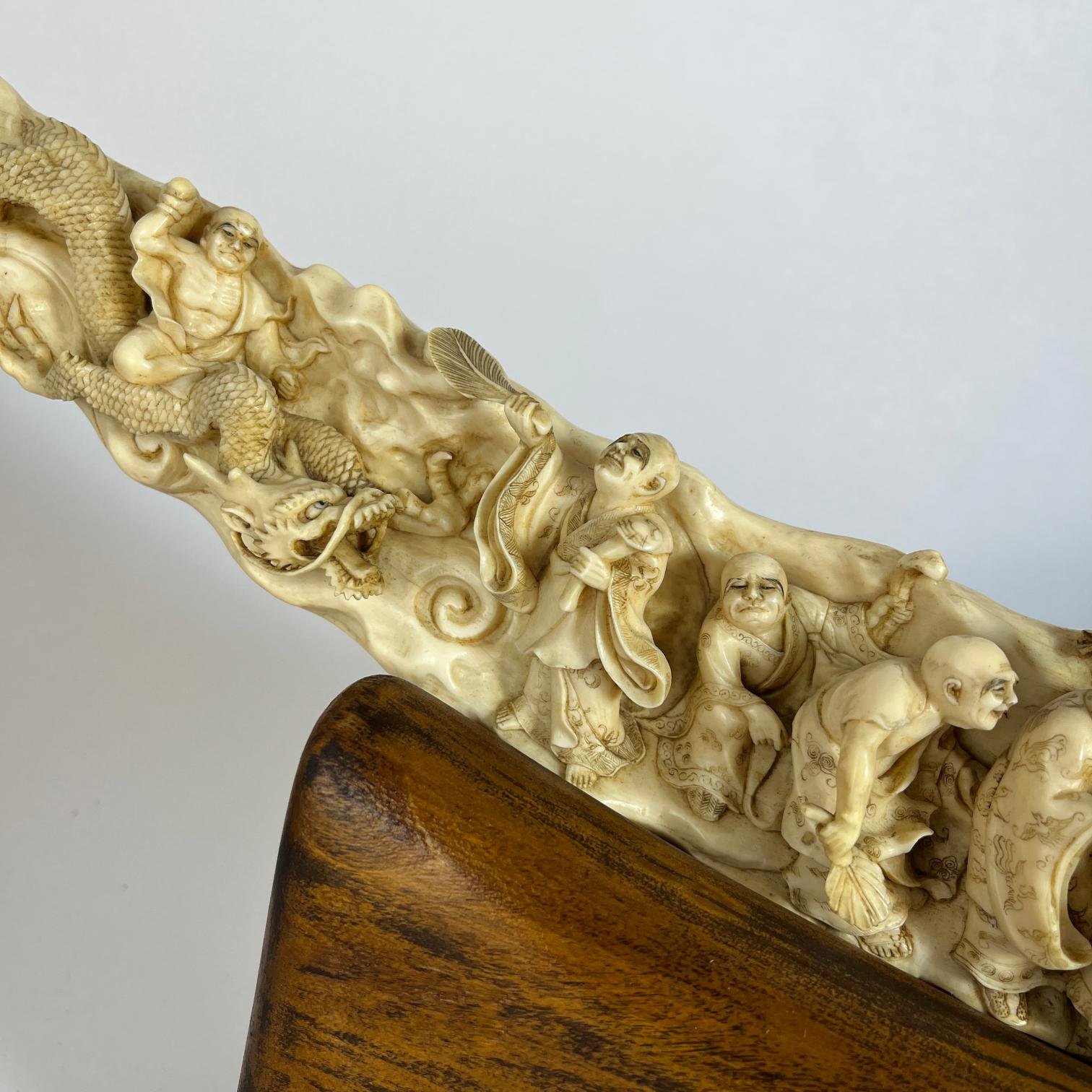 Colmillo de elefante tallado en altorrelieve. Firmado «Kodo», Japón. Período Meiji. Largo 70 cm. Presentado en soporte de madera.