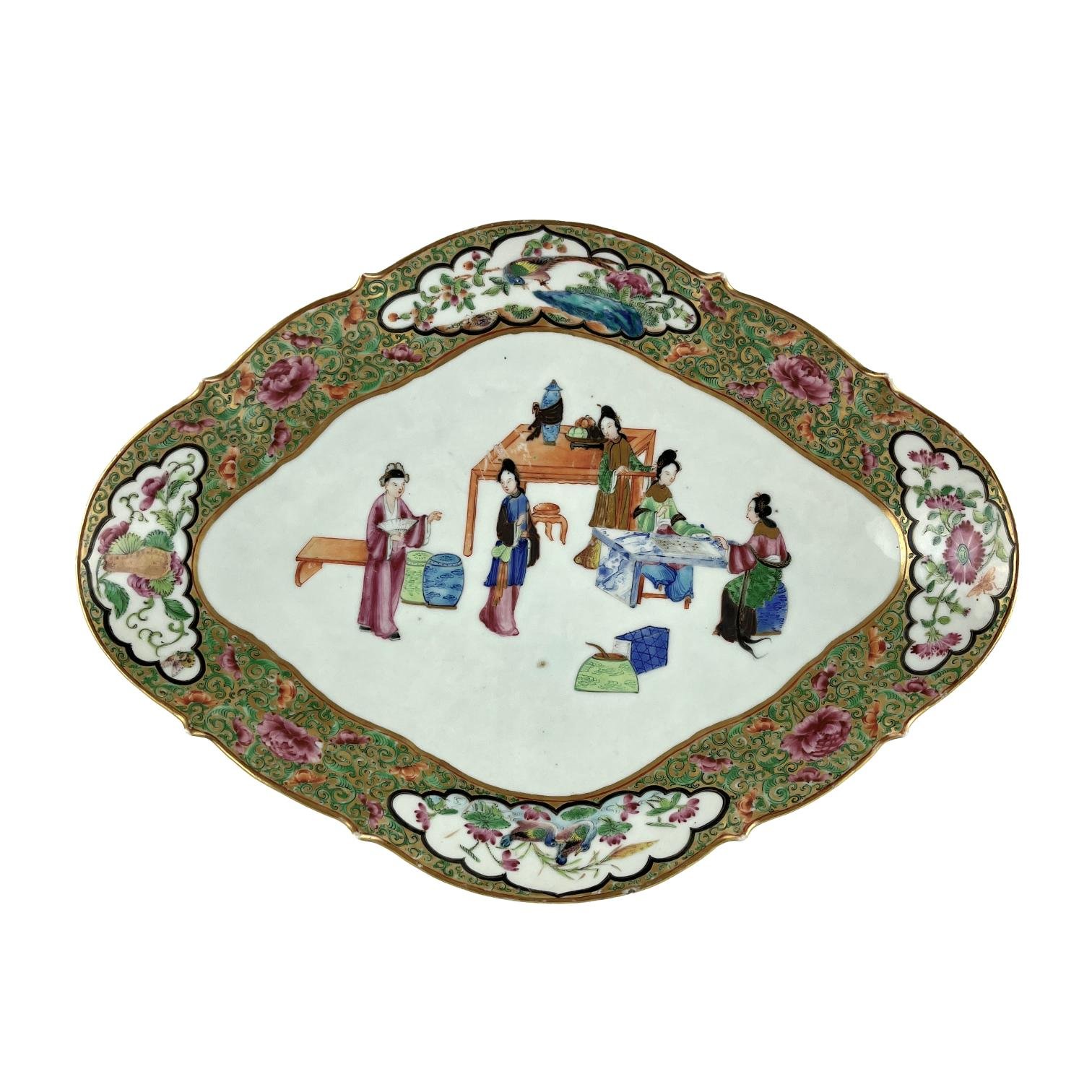 Centro chino en porcelana «Vieux Canton» decorado «personajes», en forma romboidal. S. XIX. 39 x 27 cm.