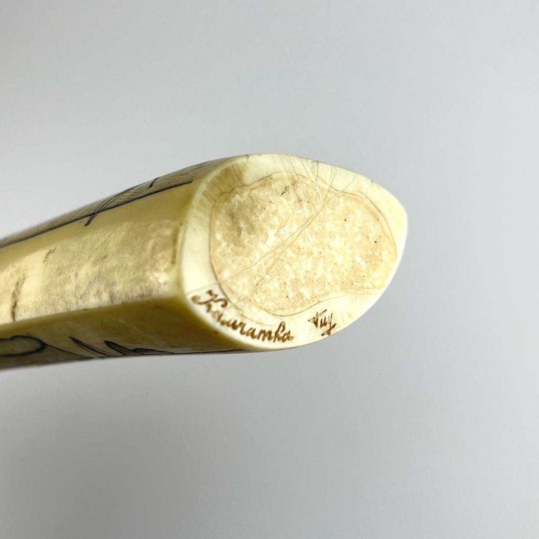 Colmillo de morsa tallado y policromado «escenas de cacería», con firma ilegible de origen ruso. Largo 52 cm. Peso 1.100 gr.