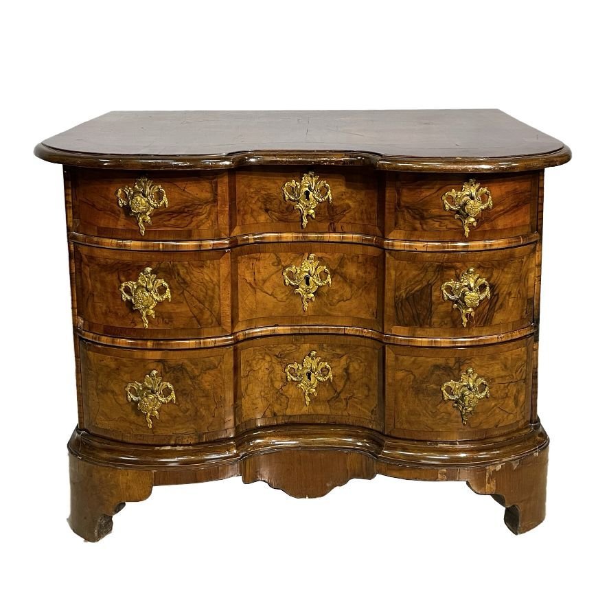 Cómoda austríaca s. XVIII enchapada en palo de rosa y raíz. Tres cajones con tiradores en bronce dorado y cincelado. 84 x 112 x 67 cm. Averías en enchapado.