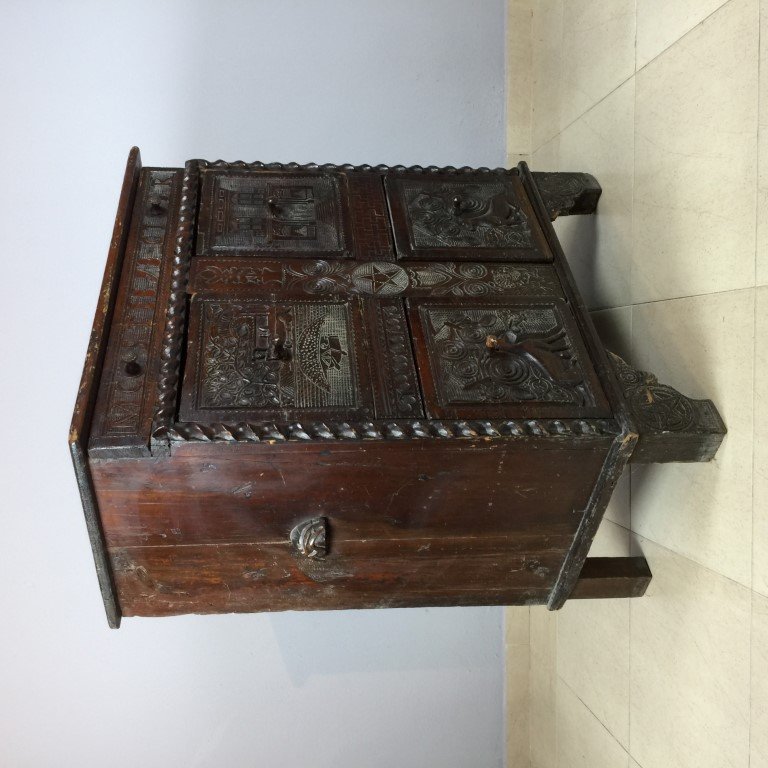 Cómoda bretona siglo XIX, en madera tarugada. Frente tallado «animales, hojas, flores, casa, tren y barco» e inscripción «MCSP 1898 GI8R». Cinco cajones con tiradores en madera tallada, uno averiado. Asas laterales en madera tallada. 102 x 86 x 52 cm.