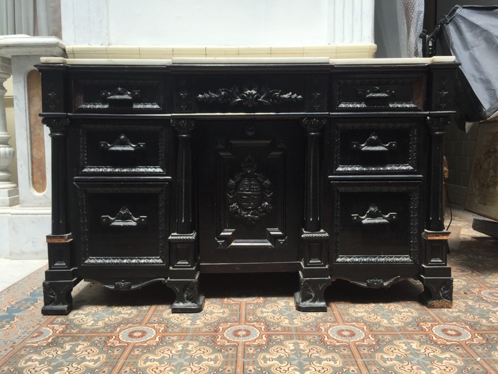Cómoda s. XIX en madera ebanizada. Siete cajones y una puerta. Tapa en mármol blanco. Frente tallado «hojas y flores». Puerta decorada «escudo de armas nacional uruguayo». 77 x 126 x 65 cm.