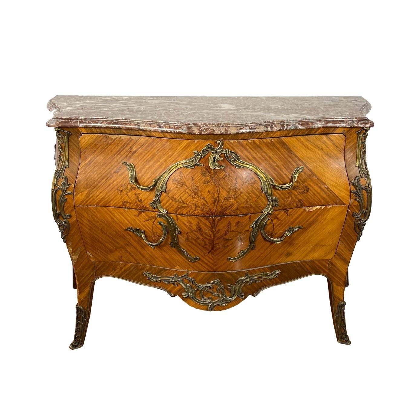 Cómoda estilo Luis XV enchapada en palo de rosa con marqueterie floral. Monturas y regatones en bronce cincelado. Tapa en mármol bordeaux veteado. Pequeñas averías en enchapado. 94 x 130 x 60 cm.
