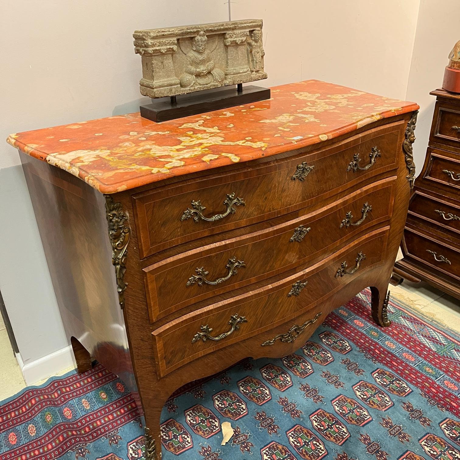 Cómoda estilo Luis XV. Tres cajones con tiradores y bocallaves en bronce. Tapa en mármol veteado. 86 x 115 x 55 cm.