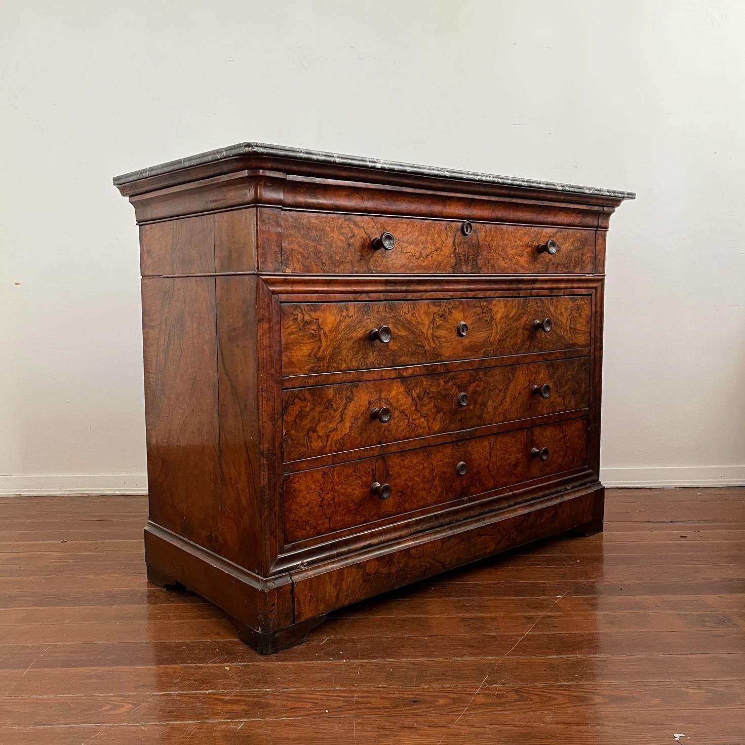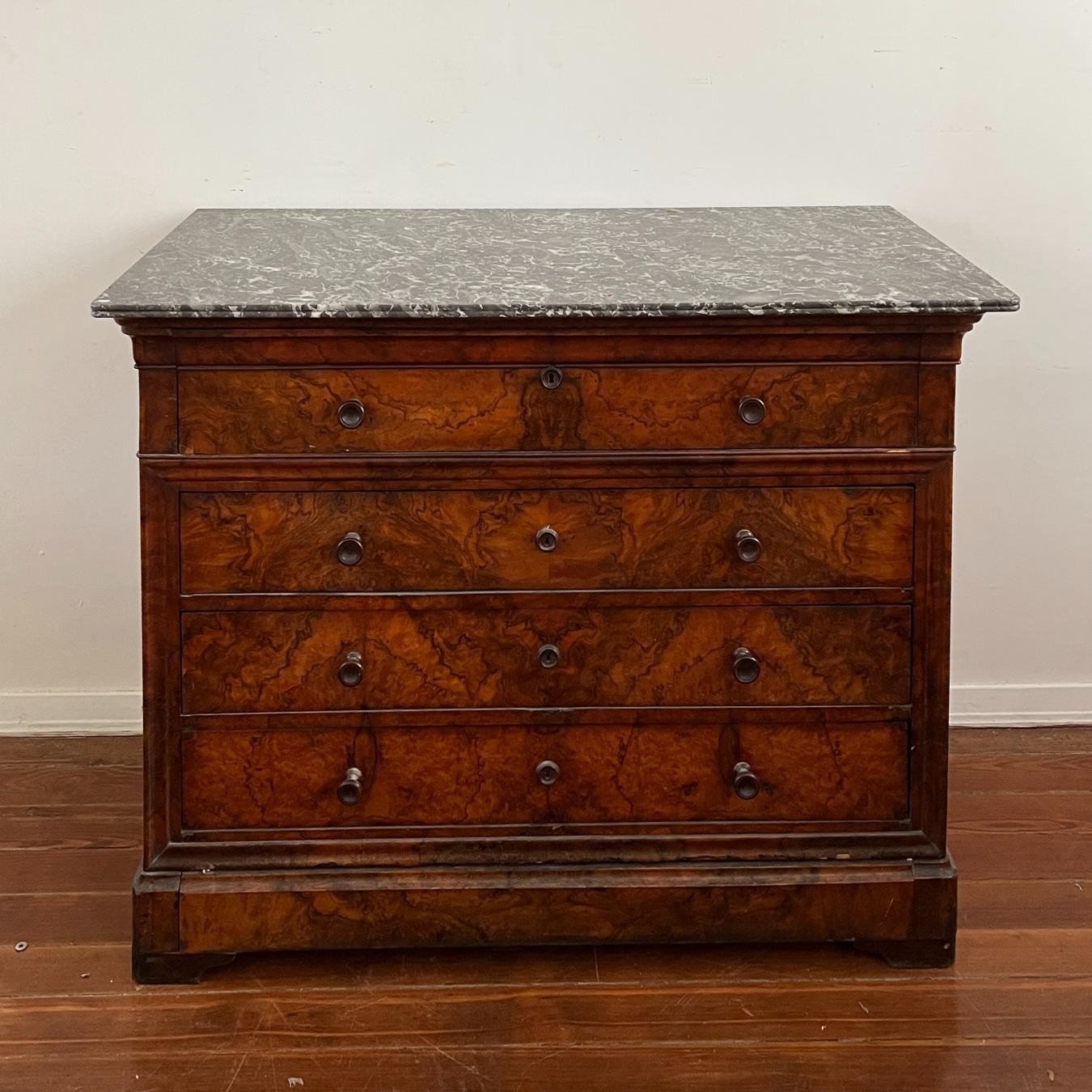 Cómoda secrétaire inglesa en madera enchapada en raíz de nogal con tapa en mármol vetado gris y blanco. Cuatro cajones inferiores, uno de ellos oculto, y un quinto falso cajón superior con tapa deslizable forrado en cuero marrón e interior con cinco pequeños cajones. 100 x 130 x 61 cm.