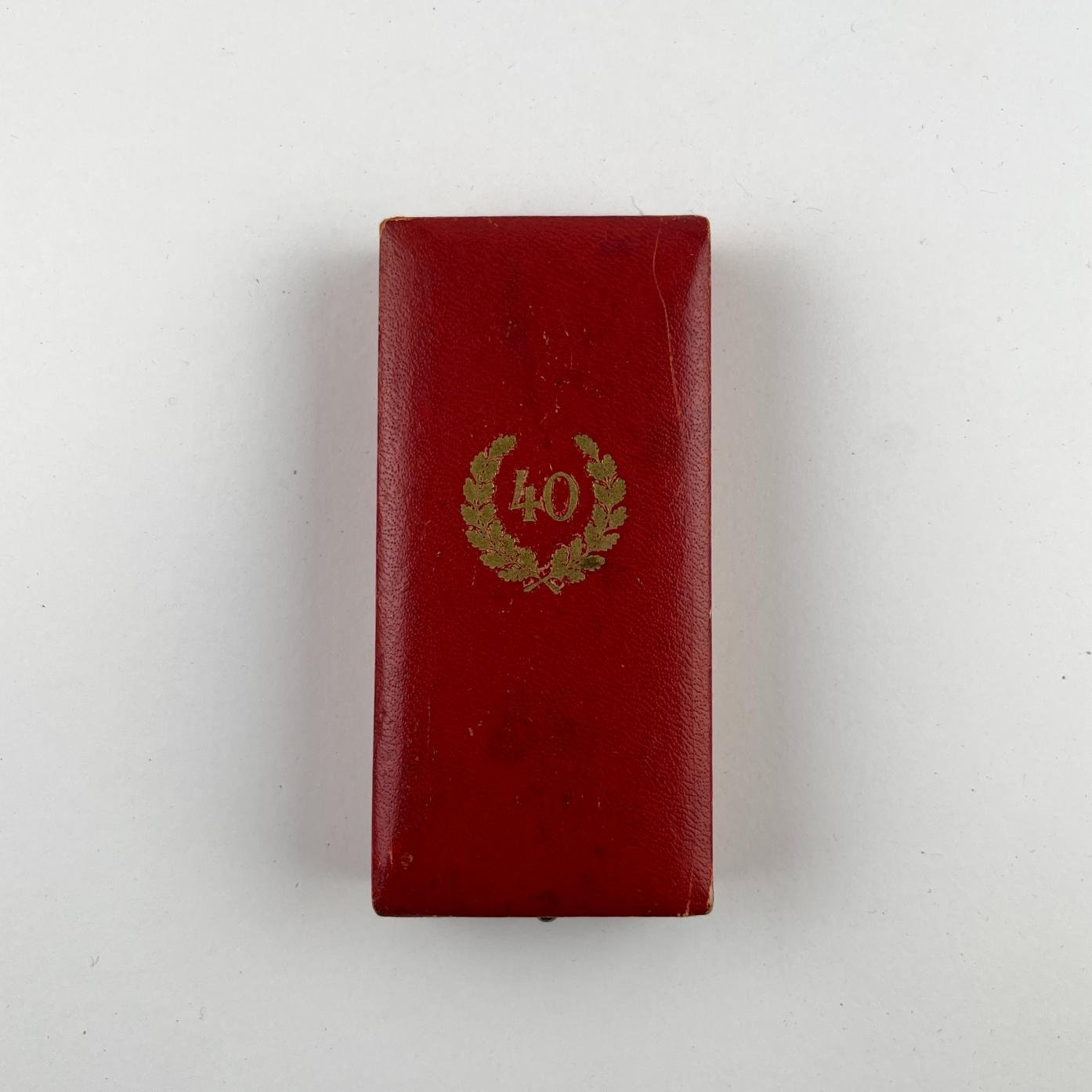 Condecoración civil alemana época nacionalsocialista en esmalte y oro. «Fur Treue Dienste», otorgada a los cuarenta años de servicio. Con cinta y estuche original.
