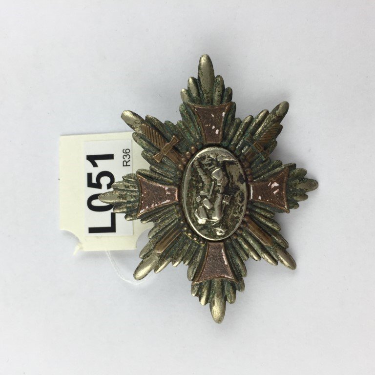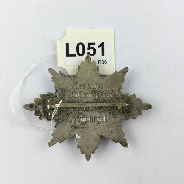Condecoración alemana en diferentes metales, con detalles en esmalte, averiado, y marcaje «Ggesgesch». «Eight pointed starburst.» Período WWI, otorgada en honor a los combatientes.