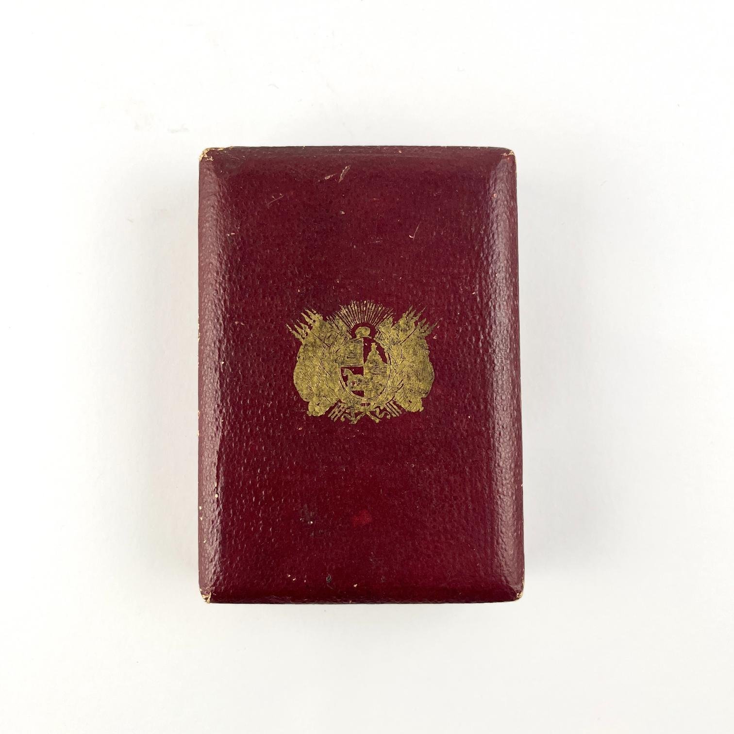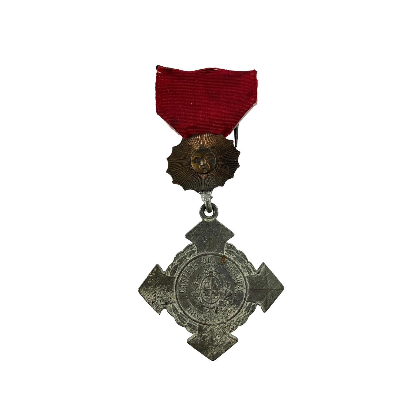 Condecoración militar época Guerra del Paraguay otorgada al Ejército Aliado por el Uruguay. “A las virtudes militares.” En hierro pavonado, con sol en cobre y cinta original. En su estuche original.