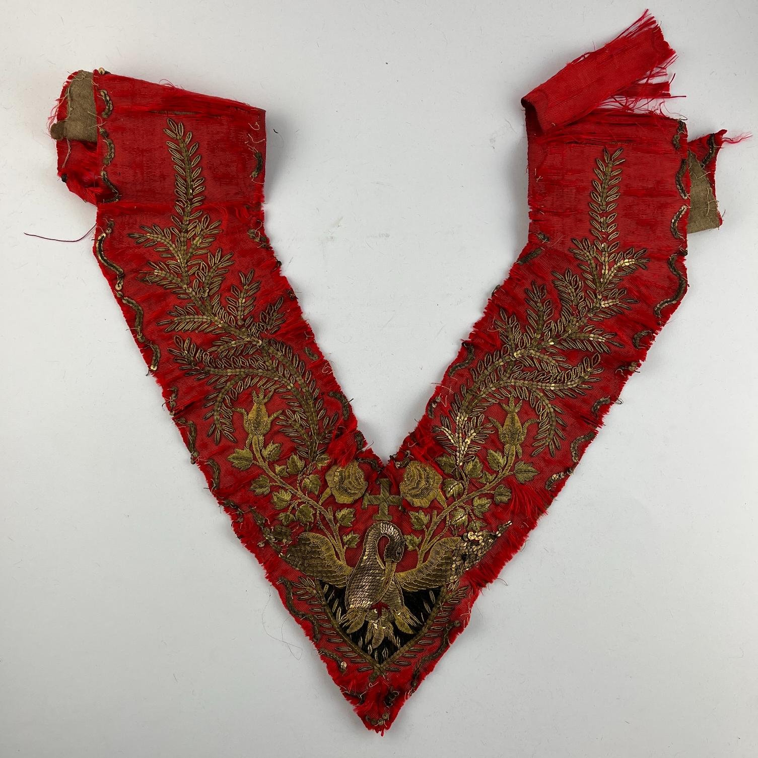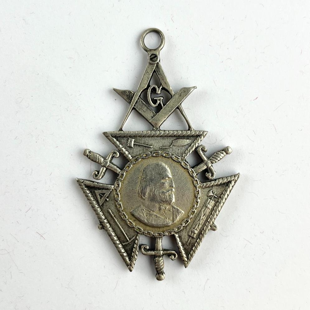 Condecoración masónica uruguaya de la Logia Garibaldi, en plata, con cinta forrada en raso rojo y bordada con mostacillas doradas y pollerín con iniciales “M.B.”.