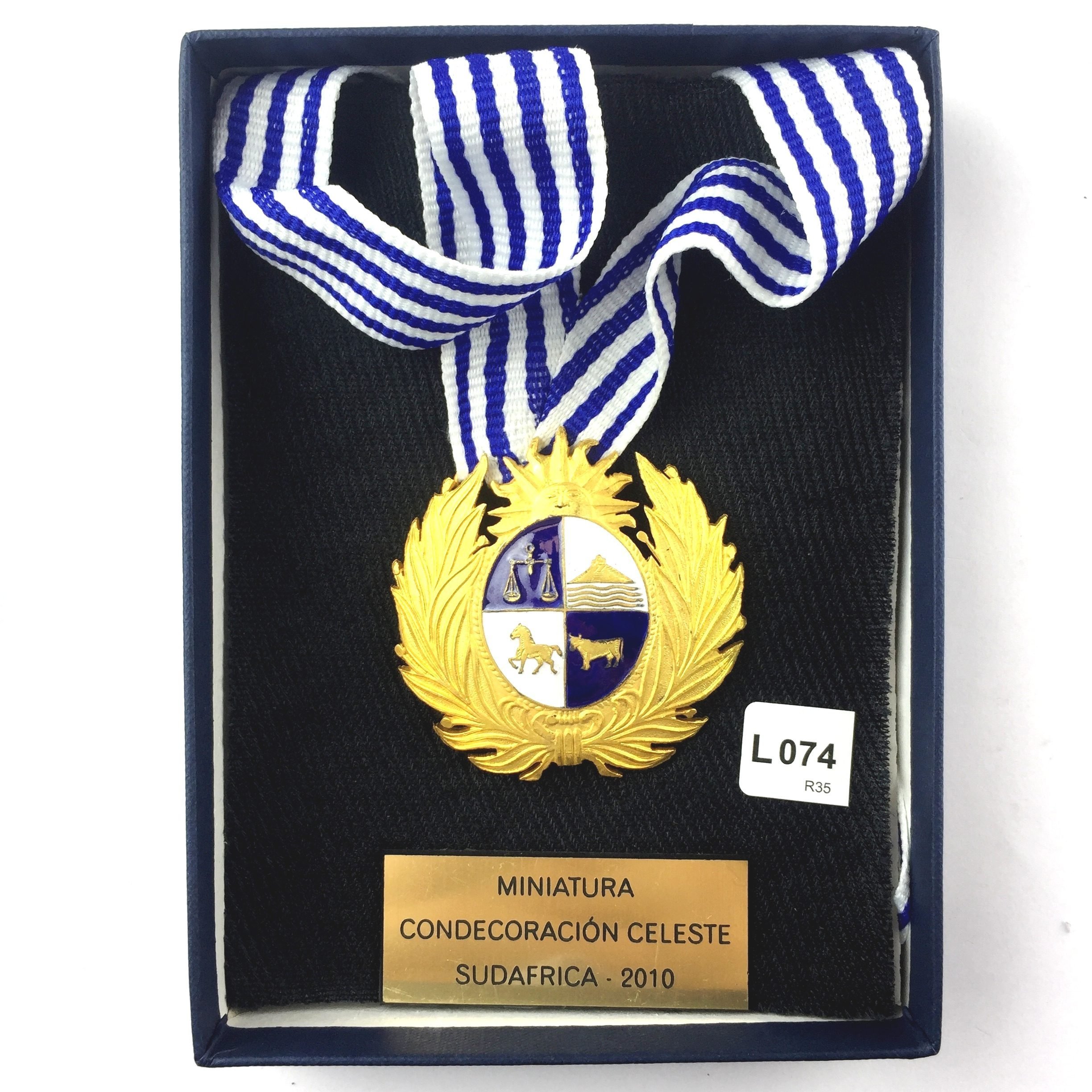 Condecoración uruguaya miniatura en bronce y esmalte otorgada por la Presidencia de la República a la Selección Uruguaya de Fútbol tras la participación en el Campeonato Mundial de Fútbol Sudáfrica 2010. Realizada por Tammaro, con cinta original.