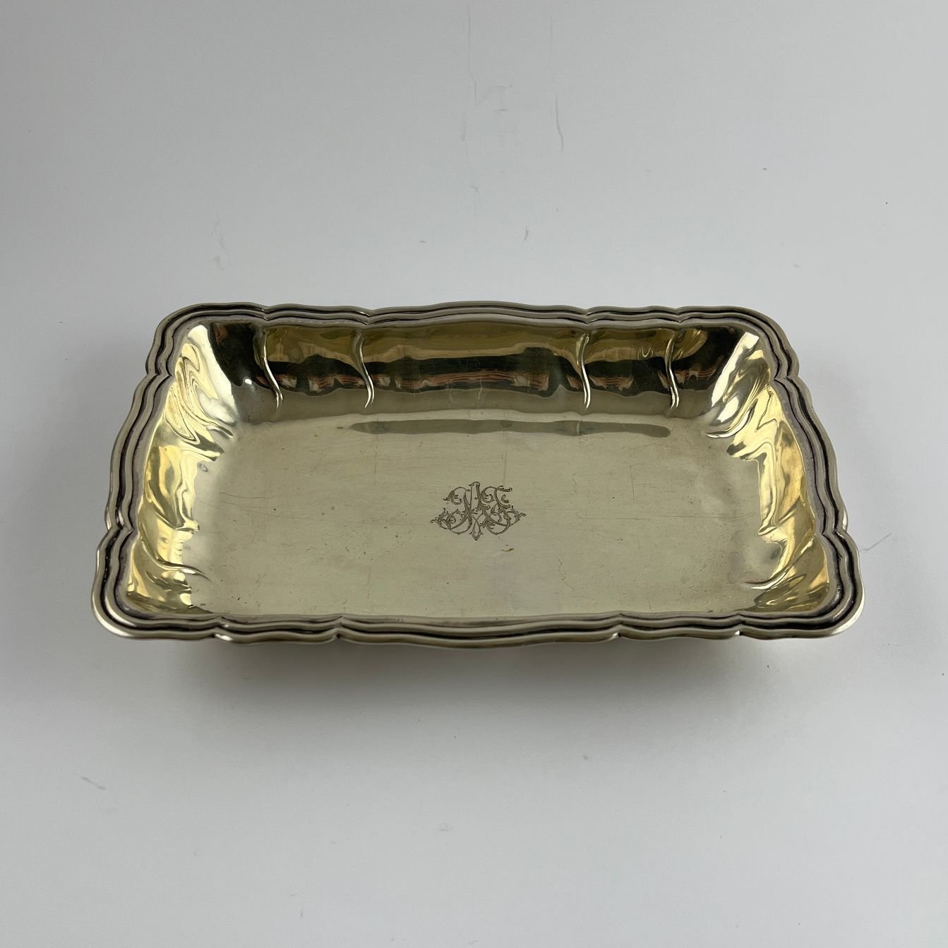 Conjunto de dos bandejas chilenas en plata martelé con borde en ondas y monograma cincelado. 3 x 25 x 17 cm y 3 x 25 x 25 cm. Peso total 885 gr.