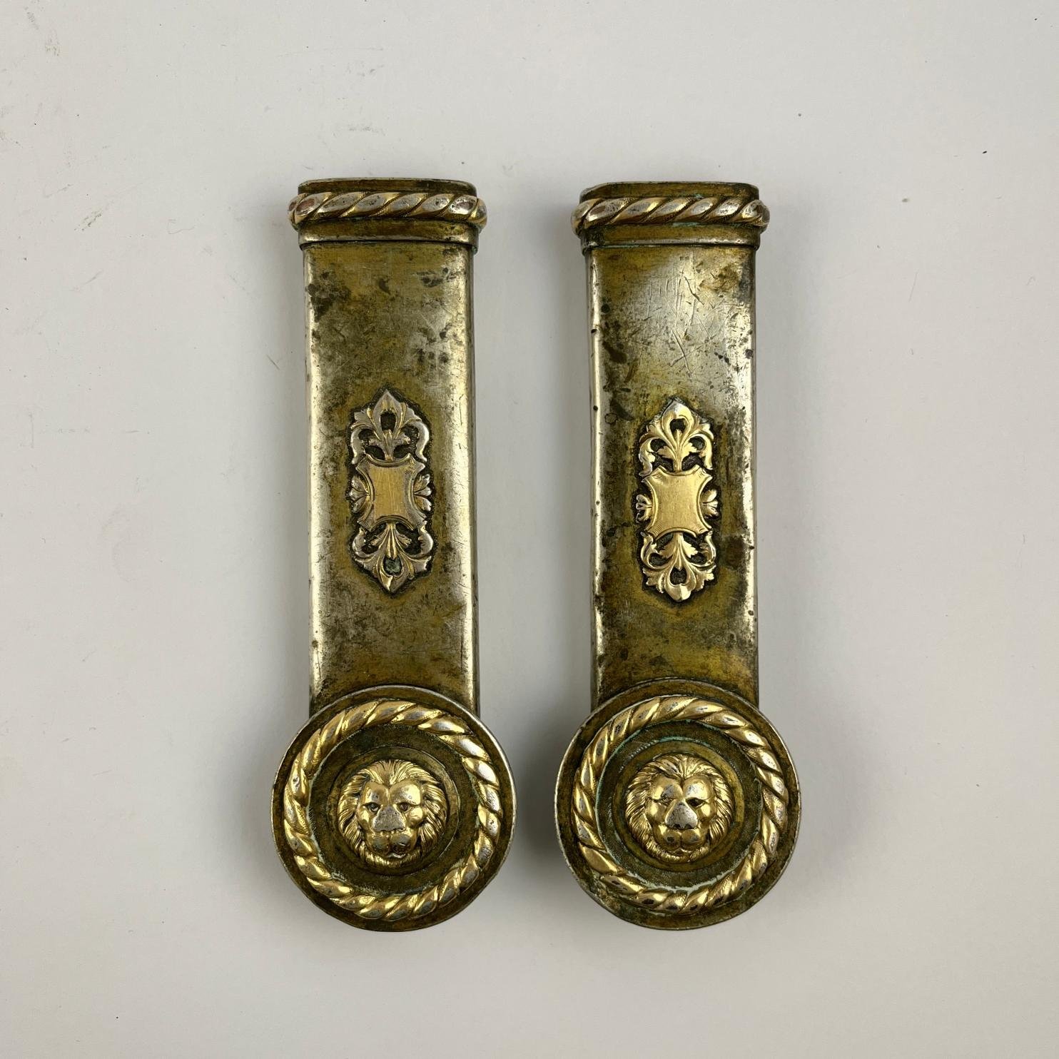 Conjunto de par de estribos tipo ingleses en plata con laterales decorados «caras de león» en oro y par de pasadores chatos de estribera en plata y oro decorados «caras de león». Largo de pasadores 15 cm.