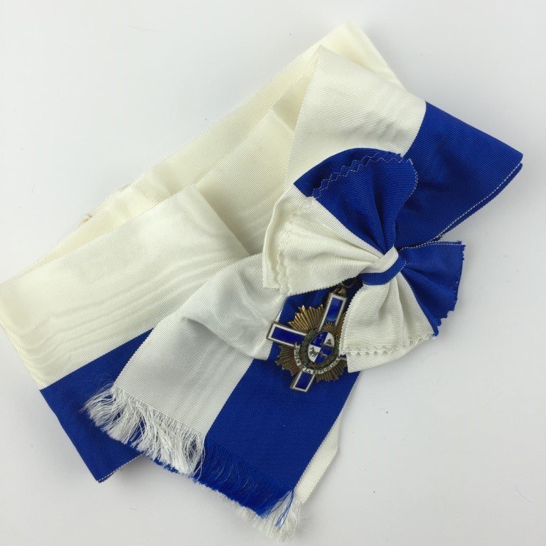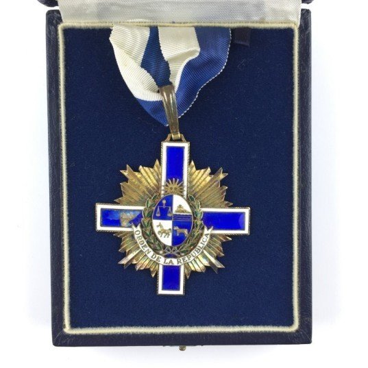 Conjunto de seis condecoraciones uruguayas «Al mérito» en plata, plata vermeil y esmalte azul, blanco y verde. Compuesto por tres veneras, una en su estuche original, y por una plaqueta y dos miniaturas veneras. Acompañado de dos botones solaperos, uno en dorado y otro en plata. Averías en esmaltes.