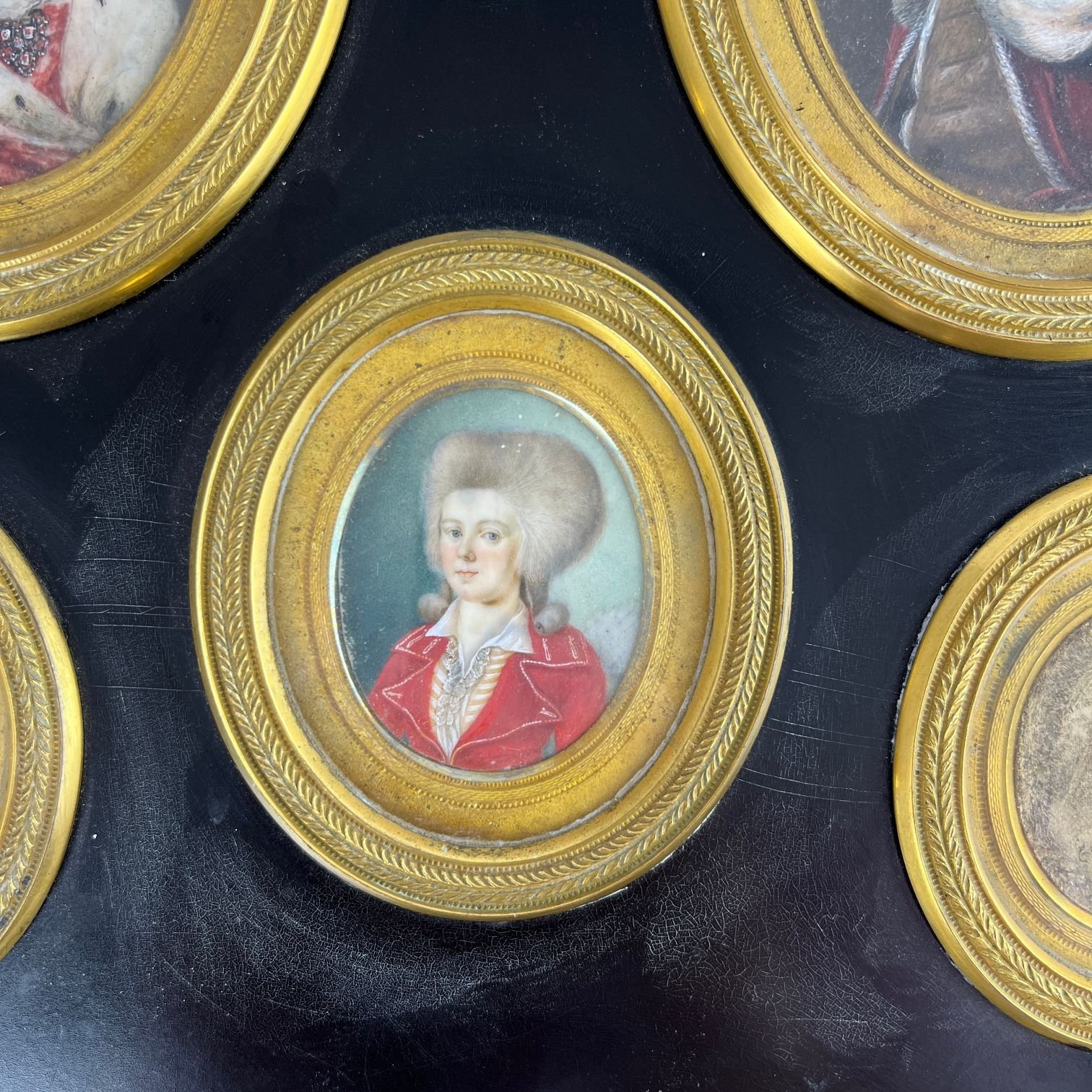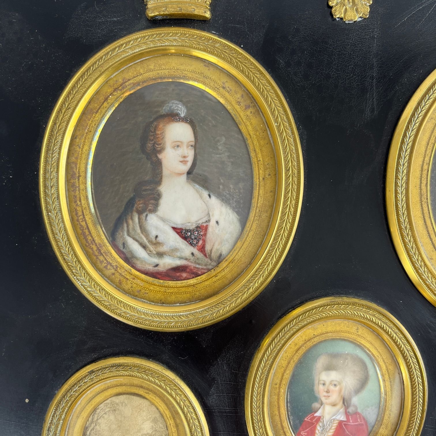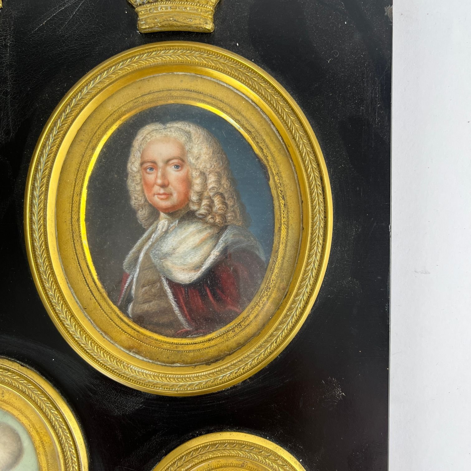 Conjunto de tres miniaturas inglesas pintadas a mano al óleo sobre marfil. «Aristócratas del siglo XVIII» y dos miniaturas en seda bordada «paisajes». Marcos ovales en bronce dorado al mercurio. Presentadas en tabla de madera ebanizada. Medidas miniaturas 7 x 5.5 y 4.5 x 3.5.