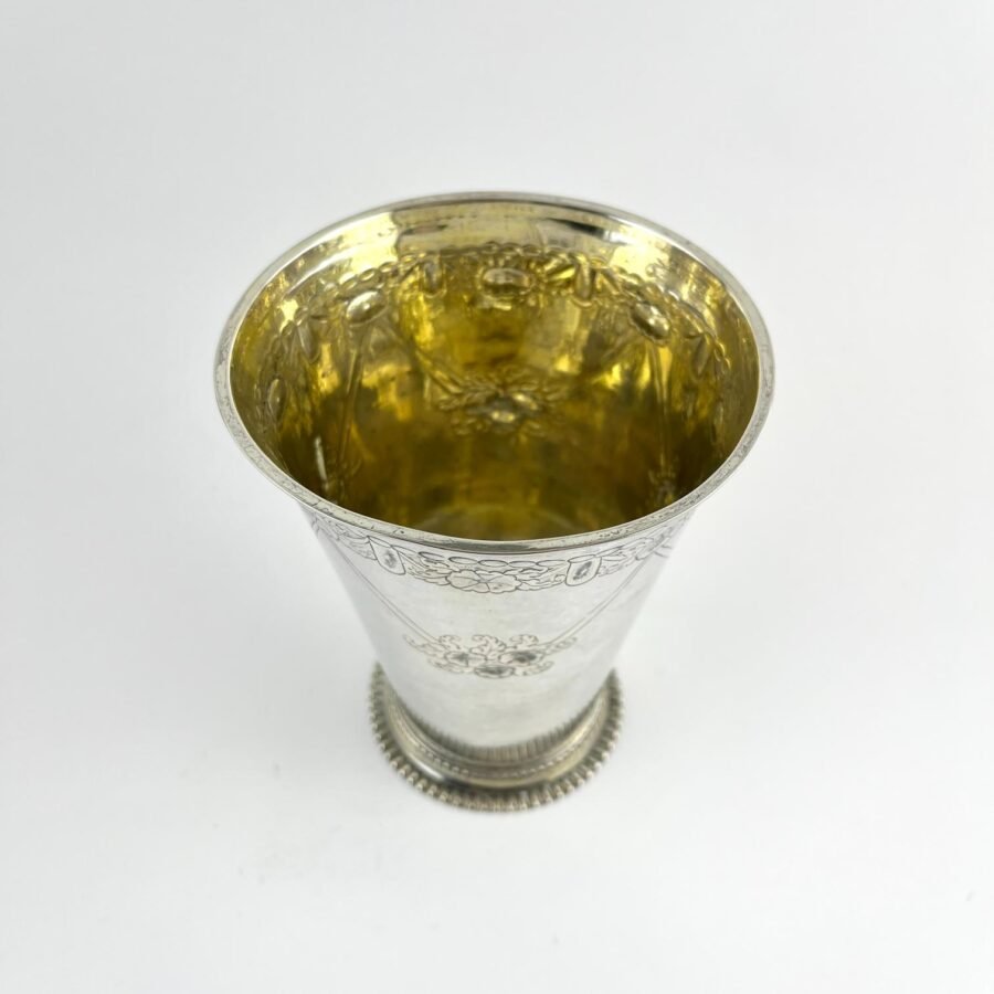 Copa en plata cincelada «hojas y flores», con borde perlado e interior vermeil. Con punzones no identificados. 14 x 11 cm. Peso 223 gr.