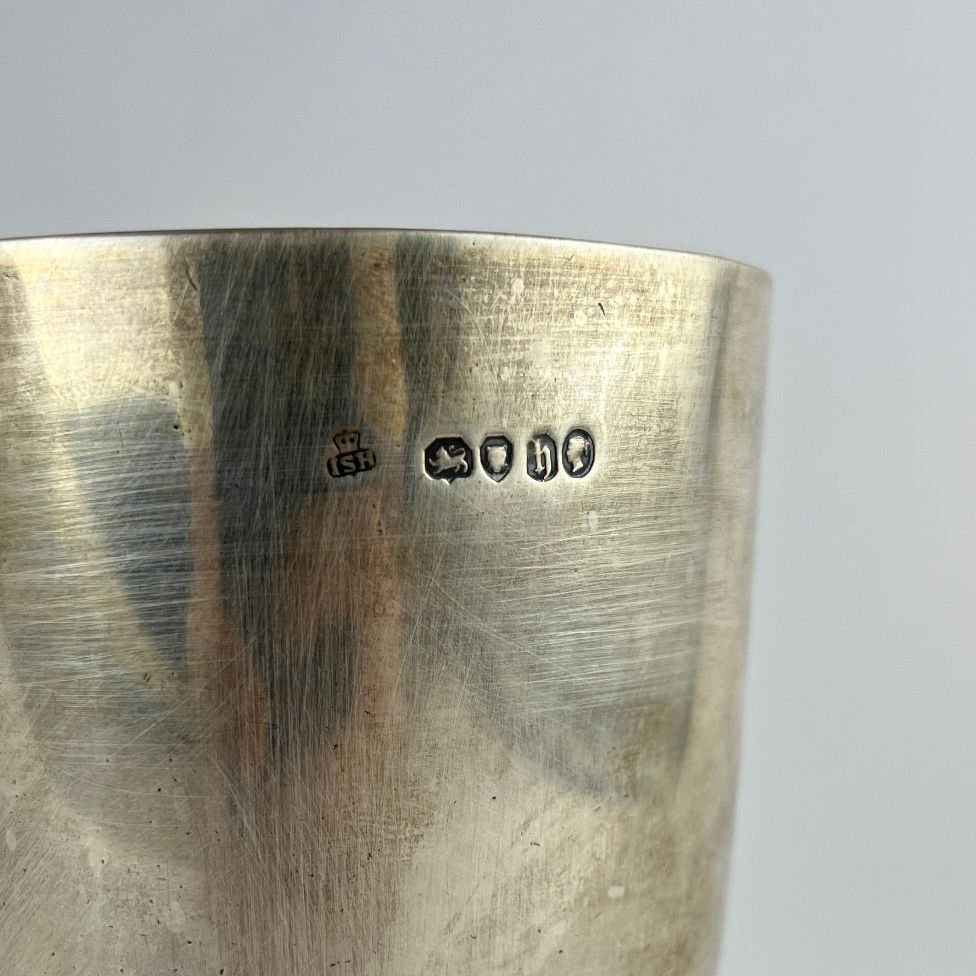 Copa ceremonial inglesa en plata de Londres año 1863 con interior vermeil y pie esculturado «vides». 14 x 8.5 cm. Peso 400 gr.