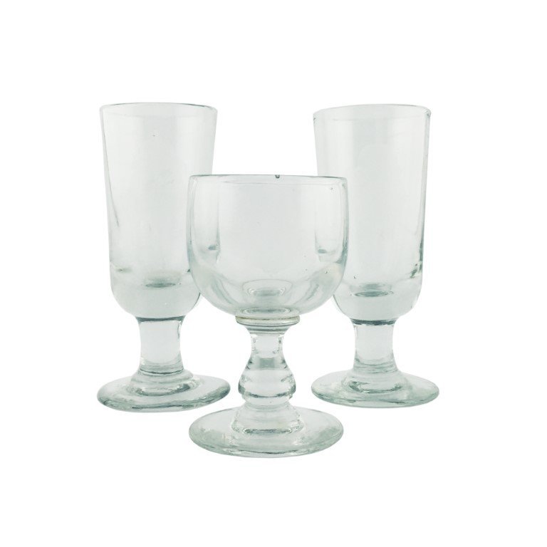 Tres copas de pulpería s. XIX en vidrio soplado, en diferentes tamaños, grabadas con escudo de armas uruguayo. Altos 18, 18 y 13 cm.