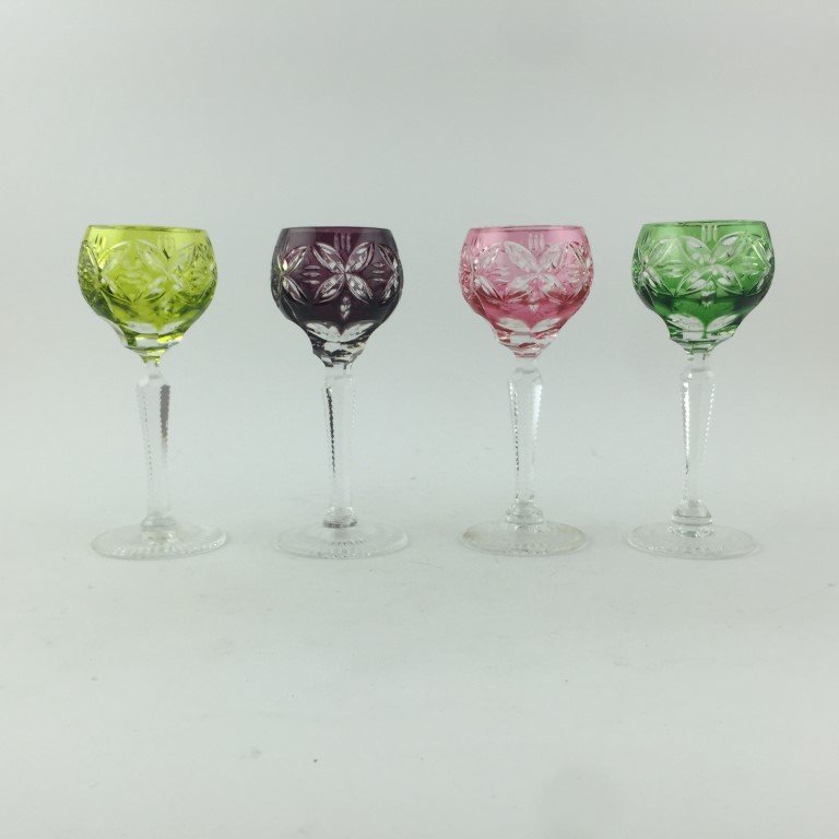 Juego de cuatro copas para licor en cristal tallado «hojas», en diferentes colores. Alto 11.5 cm.