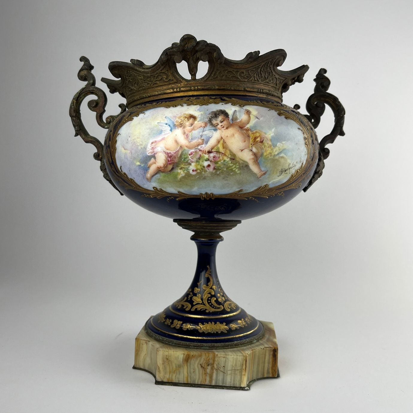 Copón francés en porcelana estilo Sèvres color azul cobalto con detalles en dorado, pintado a mano «ángeles”. Monturas en bronce y peana en ónix. Alto 23 cm.