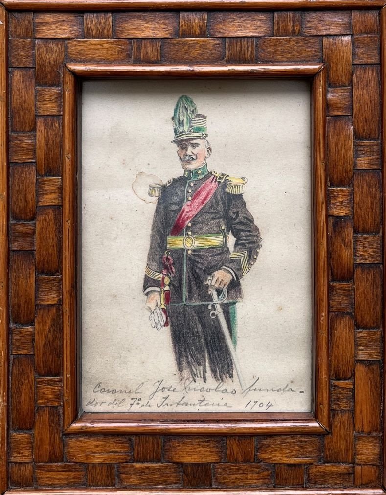 Retrato anónimo. Acuarela y lápiz sobre papel. «Coronel José Nicolao fundador del 7o. de Infantería». Titulado y fechado «1904» abajo. 18 x 12.5 cm.