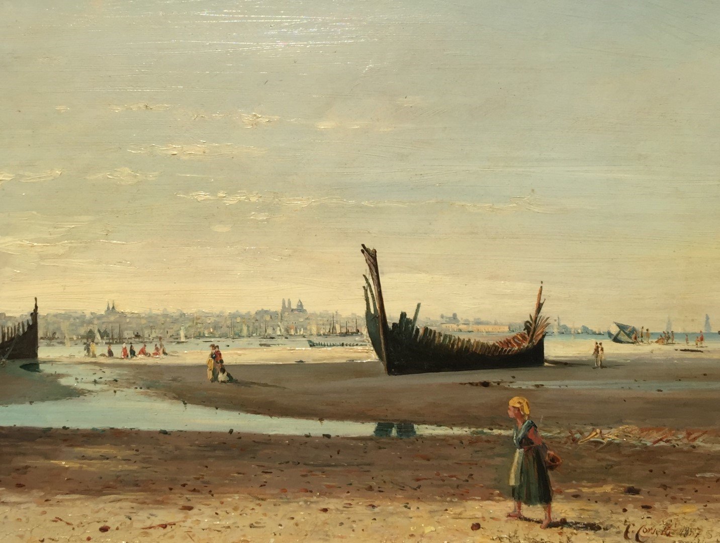 CORSETTI, Carlo (escuela uruguaya, 1823-1903). Óleo sobre tabla. «Vista de Montevideo desde Capurro con barcaza.» Firmado y fechado «1887» abajo a la derecha. 23 x 29 cm.