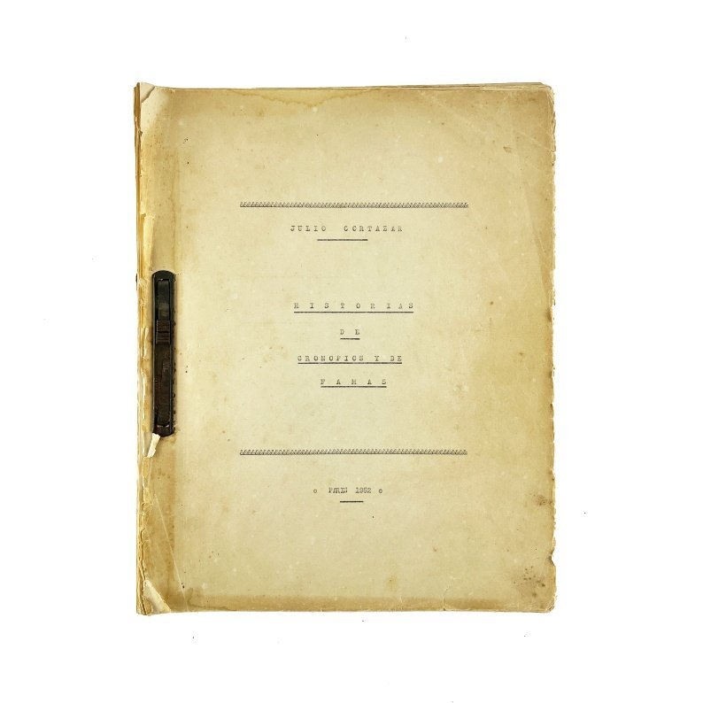 ¡Excepcional! Cuarenta y seis relatos breves, mecanoscritos originales de este consagrado autor. Treinta y cinco de ellos fueron publicados casi sin variantes en la primera edición de Historias de cronopios y famas (Buenos Aires, Ed. Minotauro, 1962); otros cuatro salieron a la luz en distintas publicaciones posteriores, y siete de ellos, de acuerdo a los estudios realizados, permanecen aún inéditos. En 4° (28,5 x 22,8 cm), 60 hojas -todas escritas en una sola cara. El original, en muy buen estado, se entrega conservado en una caja hecha “ad hoc” con materiales de conservación patrimonial.
