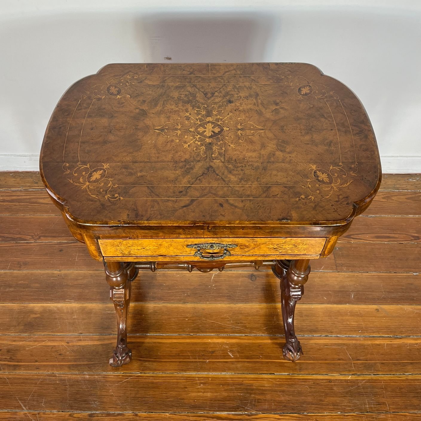 Costurero inglés enchapado en raíz de nogal con marqueterie floral. Un cajón con tirador en bronce, cajón para retazos y cuatro patas con rueditas. 72 x 62 x 40 cm.